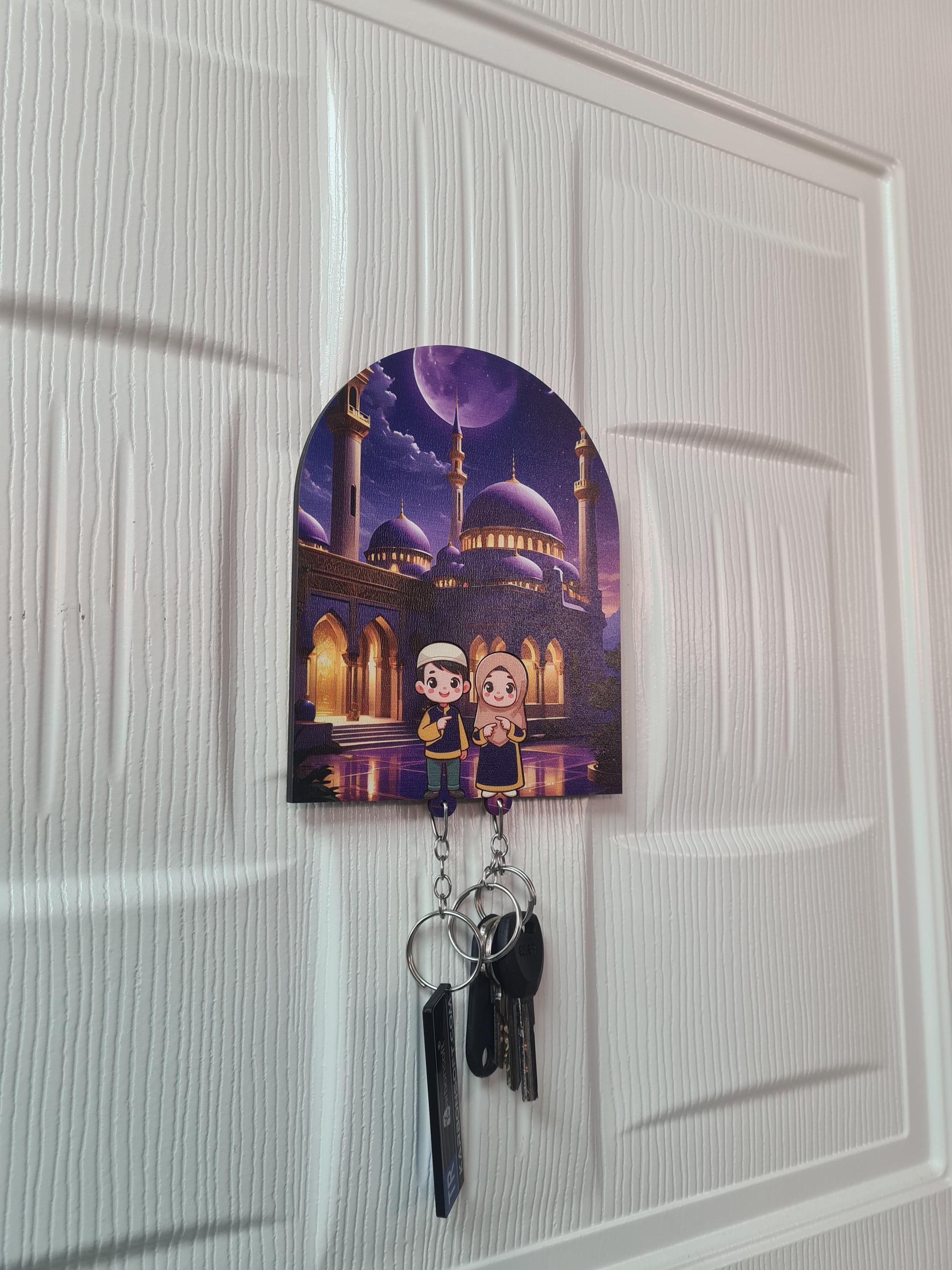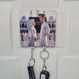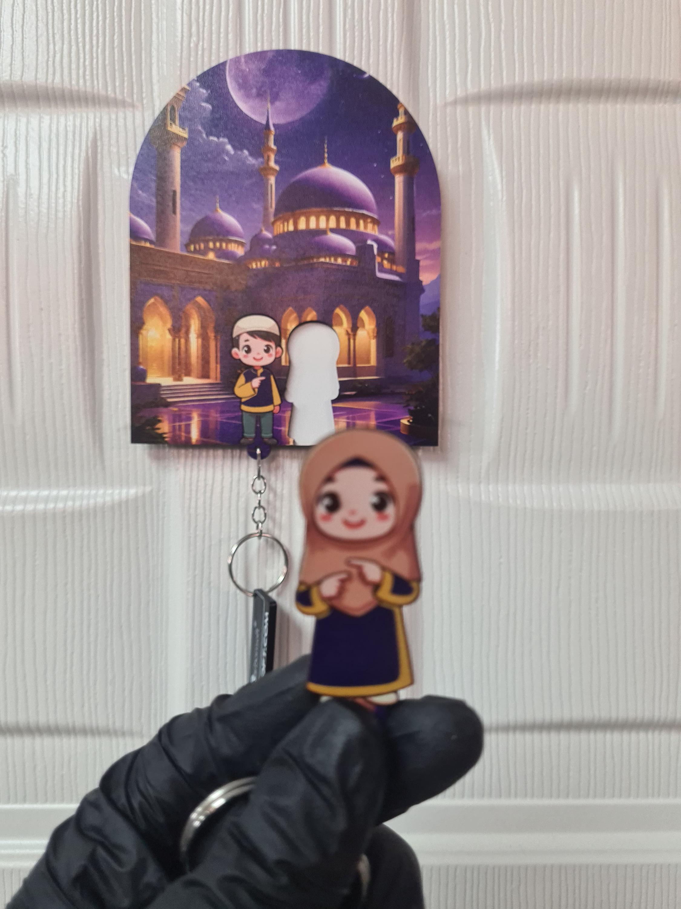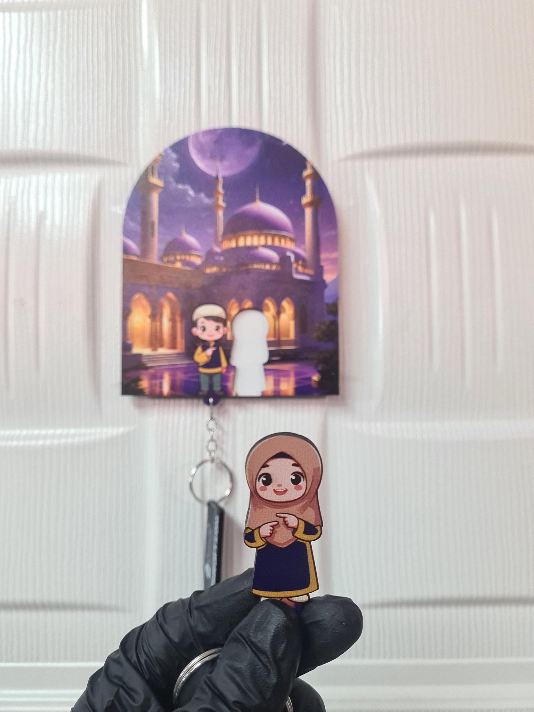 Looking for a meaningful and stylish solution to keep your keys organized at home? The Wooden Keychain and Hook featuring a man and a woman with a headscarf and a mosque in the background is perfect for you! This unique product showcases beautiful figures of a man and a woman with a headscarf along with a mosque background.