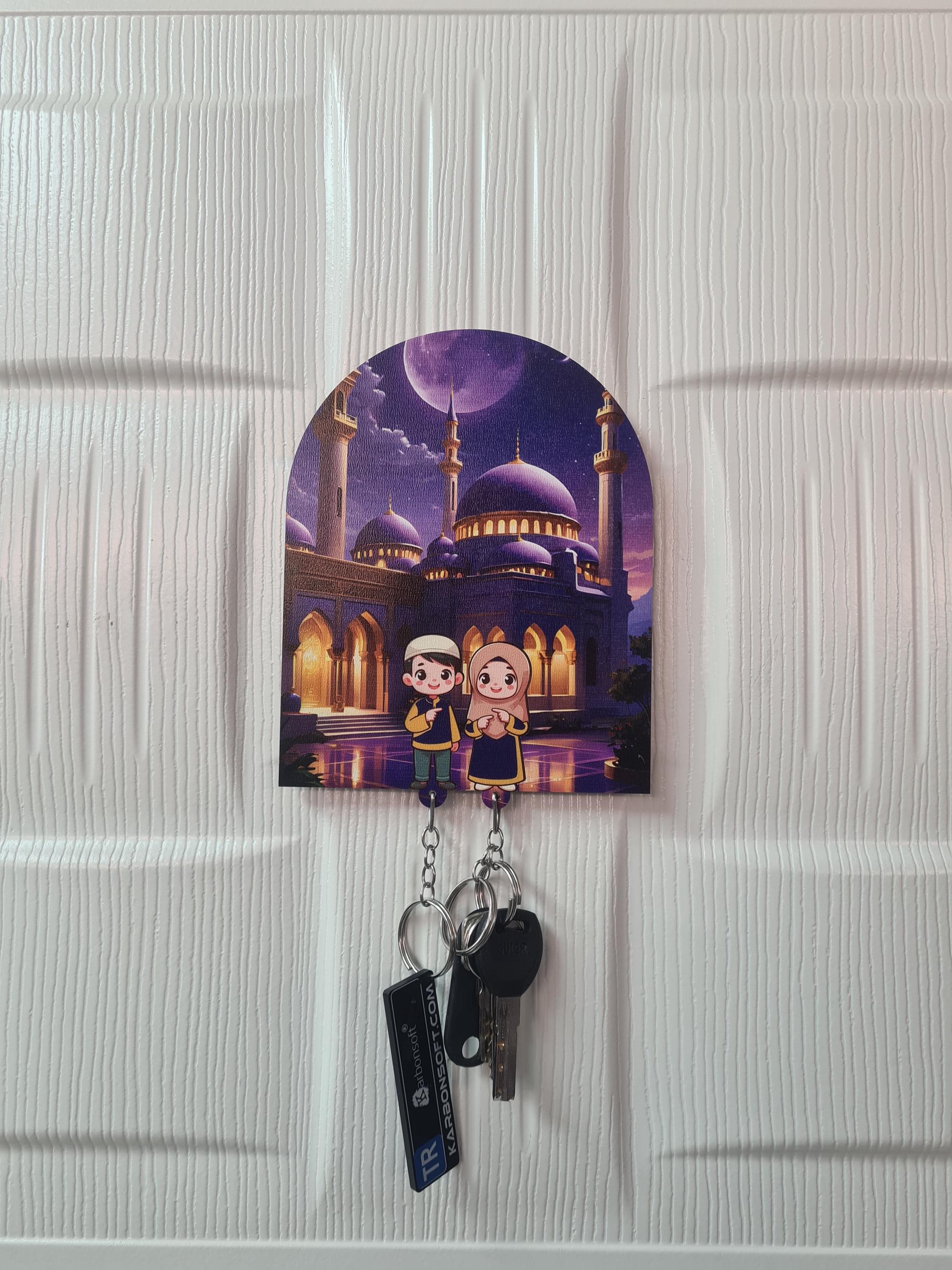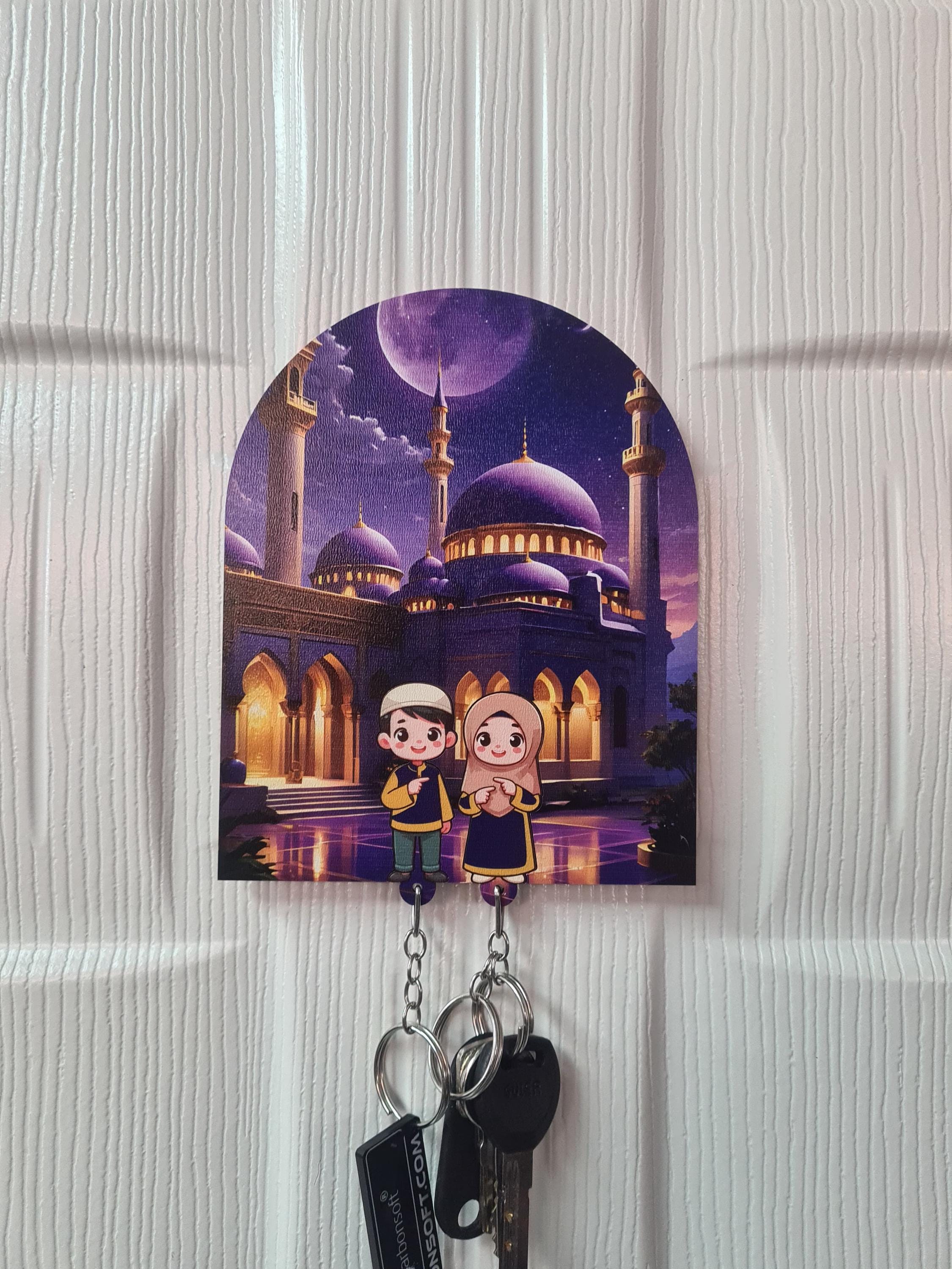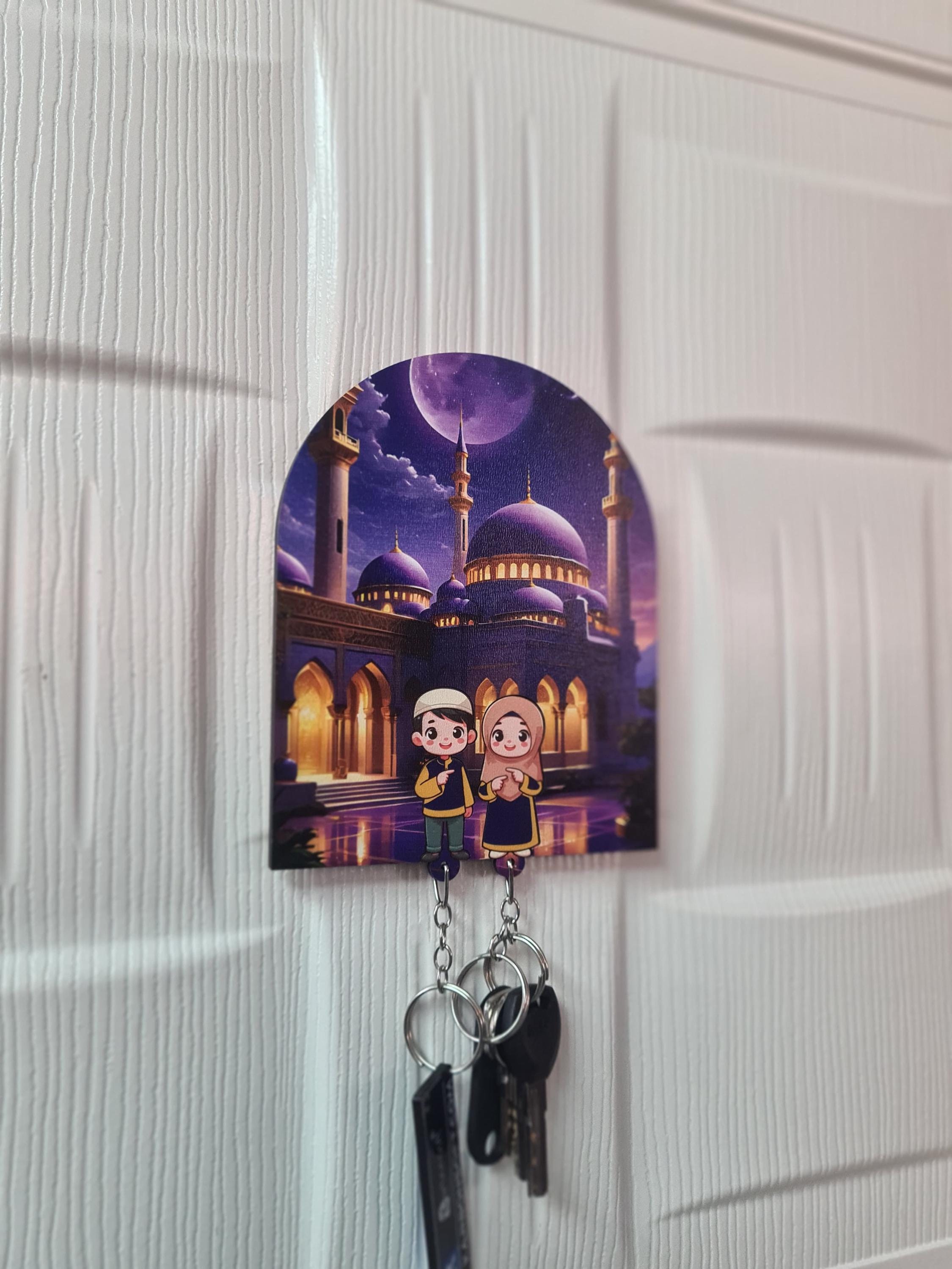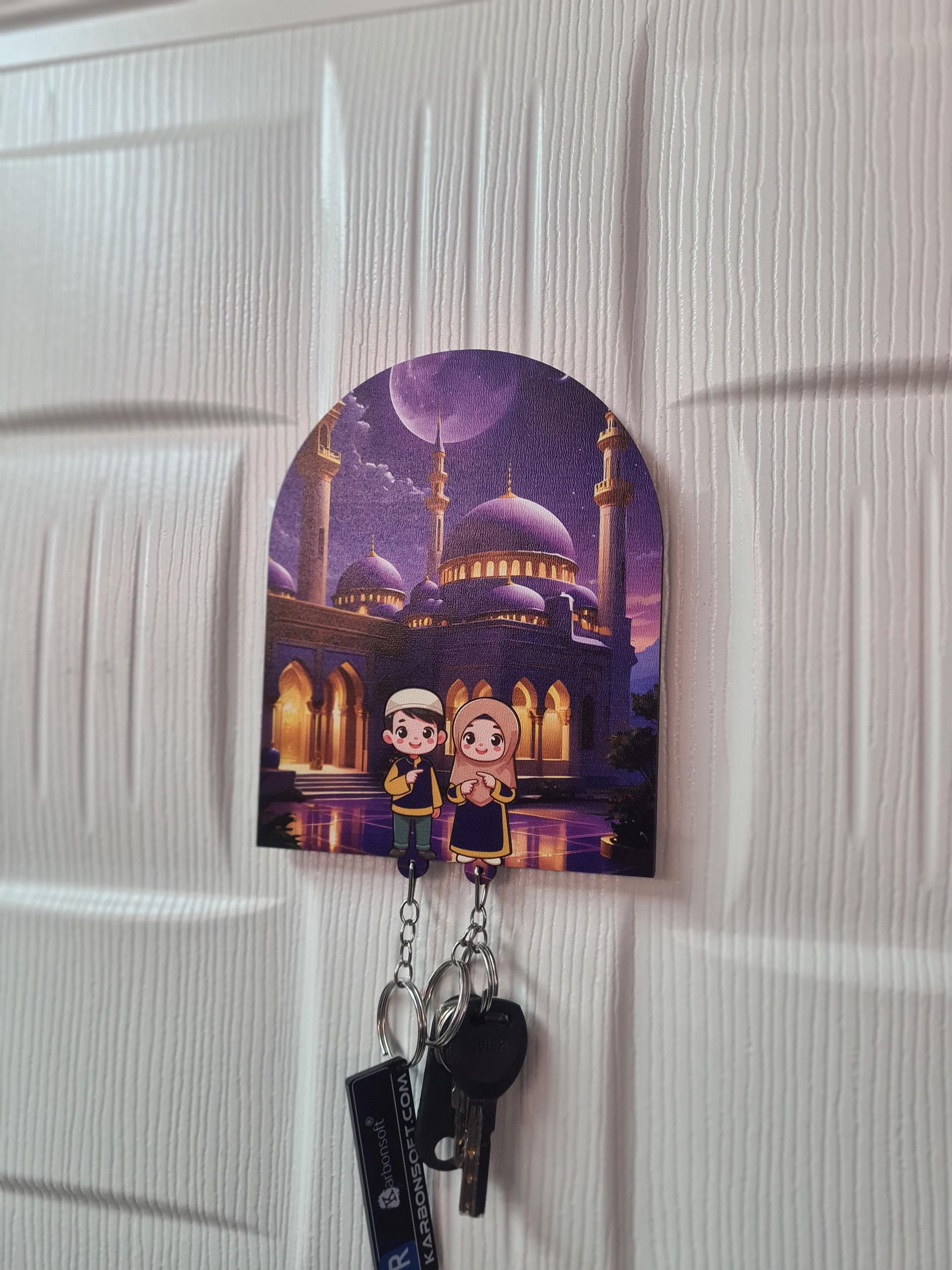 Looking for a meaningful and stylish solution to keep your keys organized at home? The Wooden Keychain and Hook featuring a man and a woman with a headscarf and a mosque in the background is perfect for you! This unique product showcases beautiful figures of a man and a woman with a headscarf along with a mosque background.