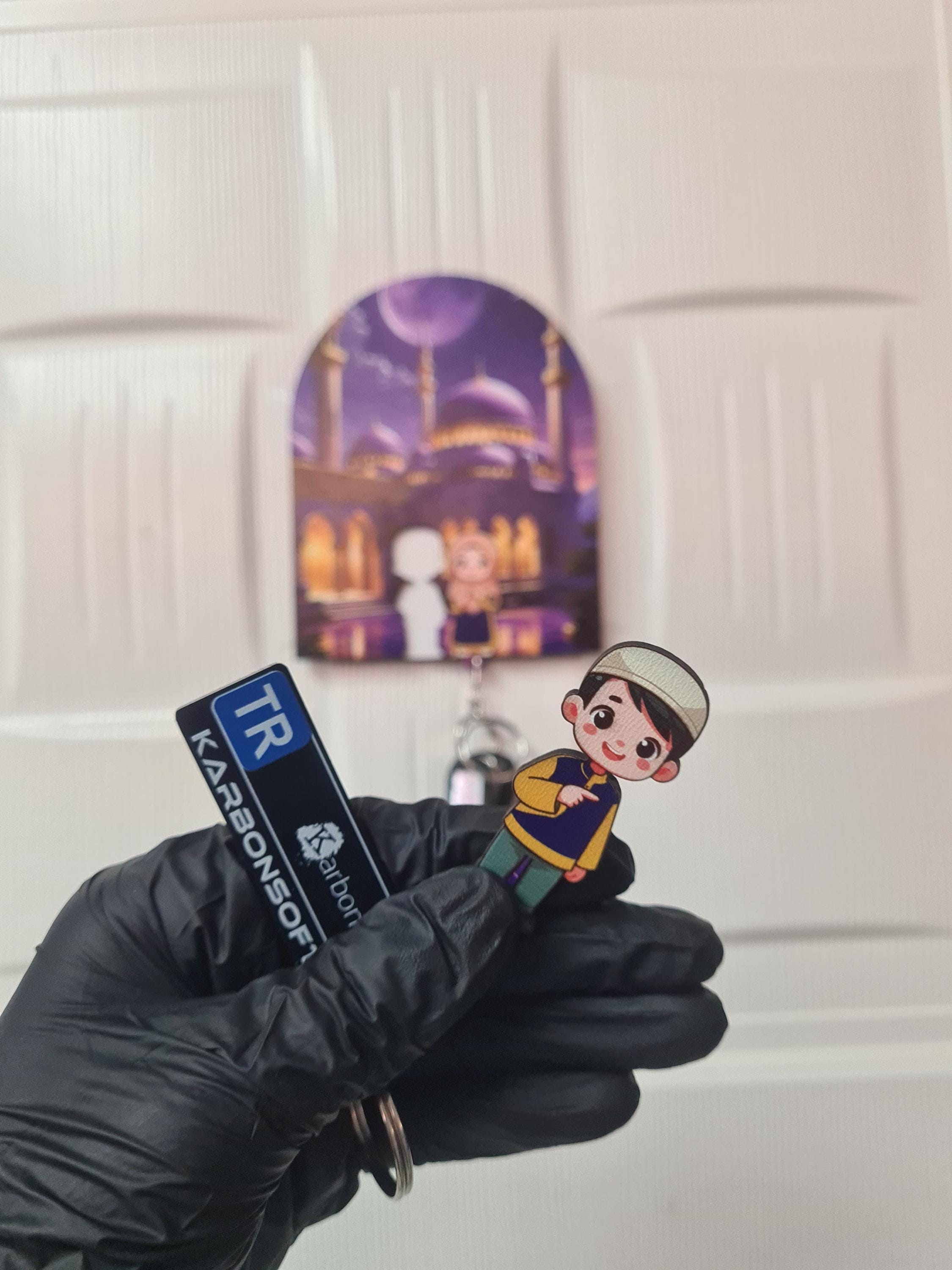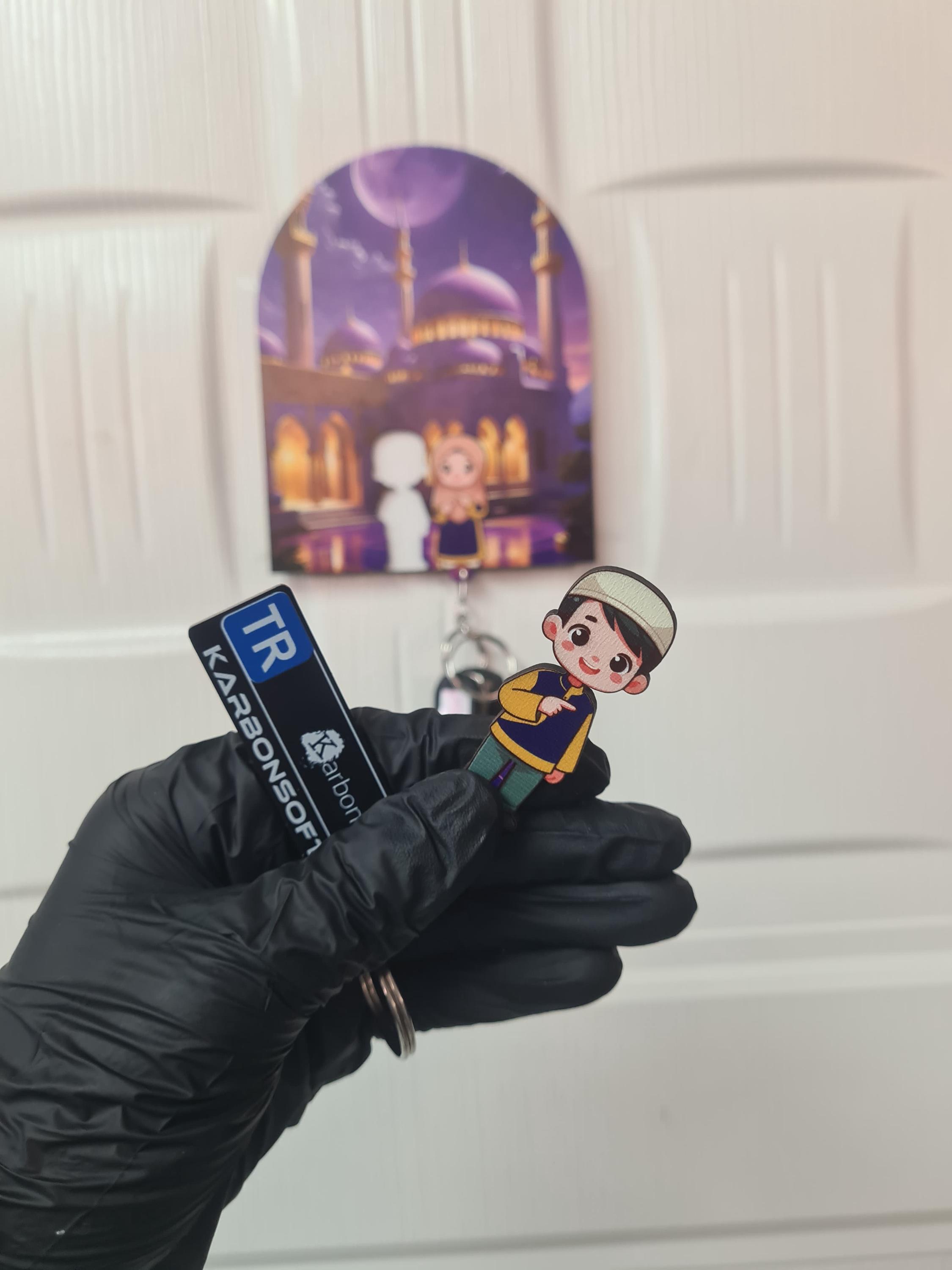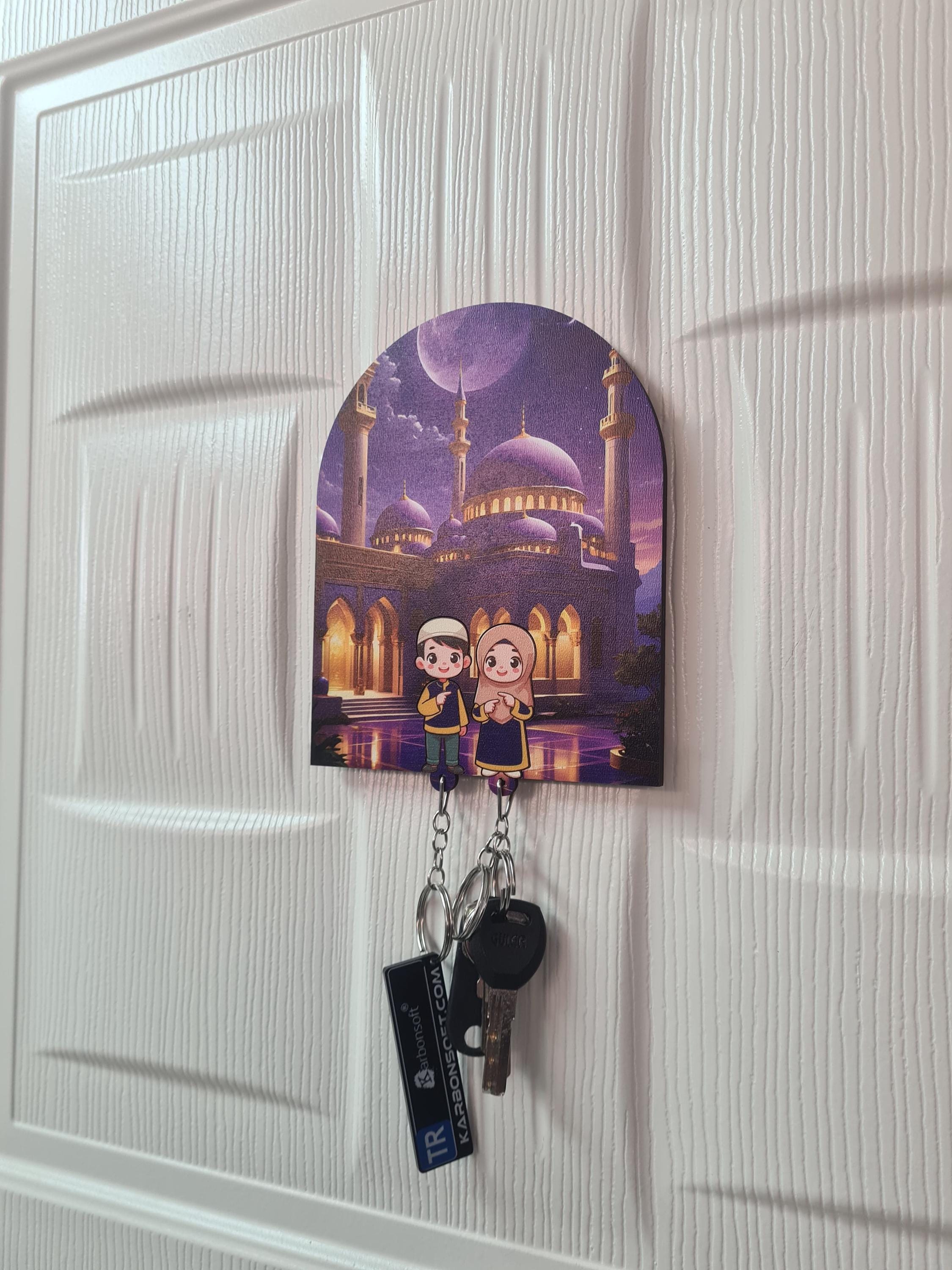 The Wooden Keychain and Hook featuring a man and a woman with a headscarf and a mosque combines functionality and aesthetics. It helps you find your keys easily while carrying this meaningful design with you. Made from durable materials for long-lasting use, this product is an ideal choice to add meaning to your special moments.
