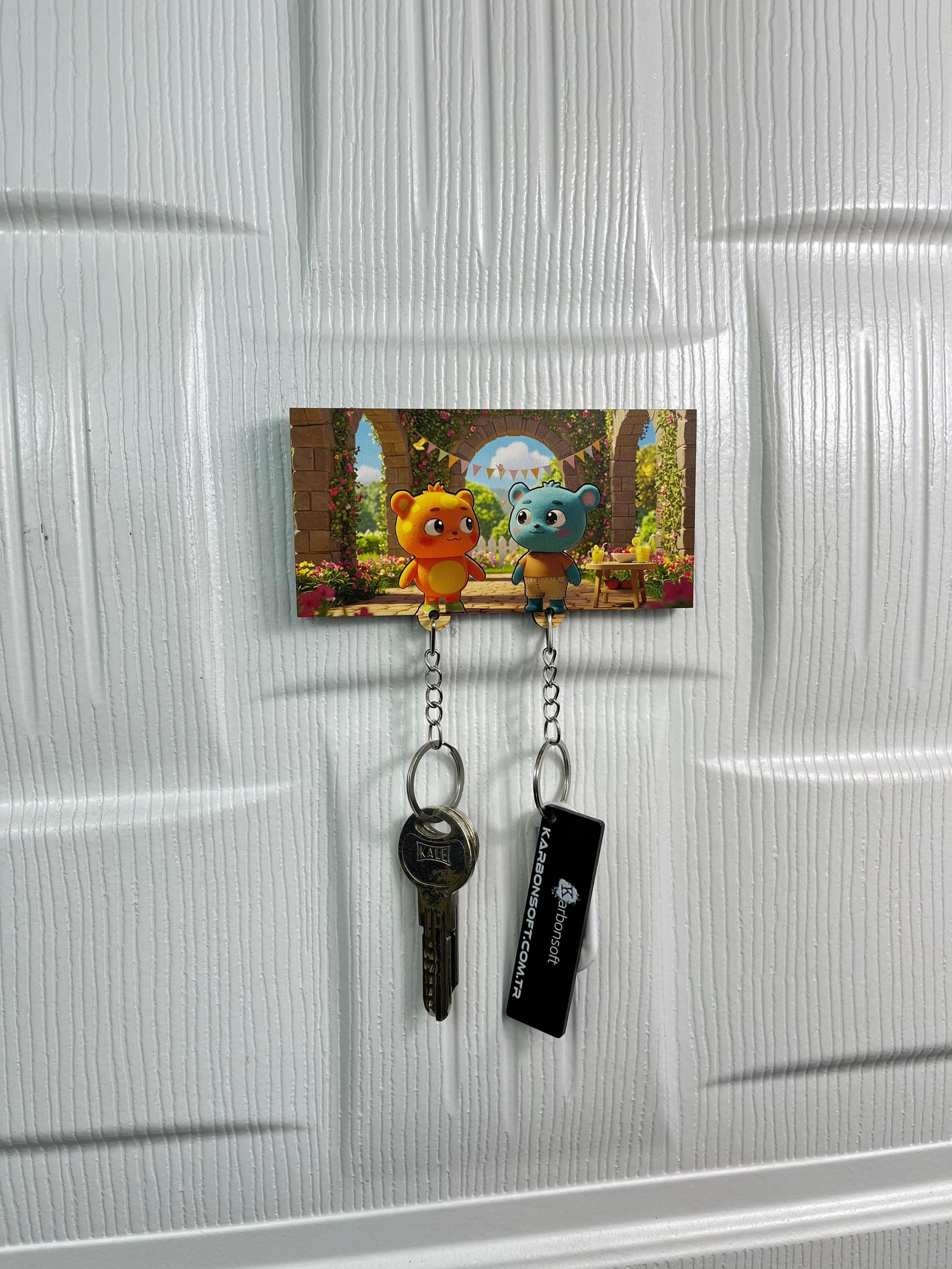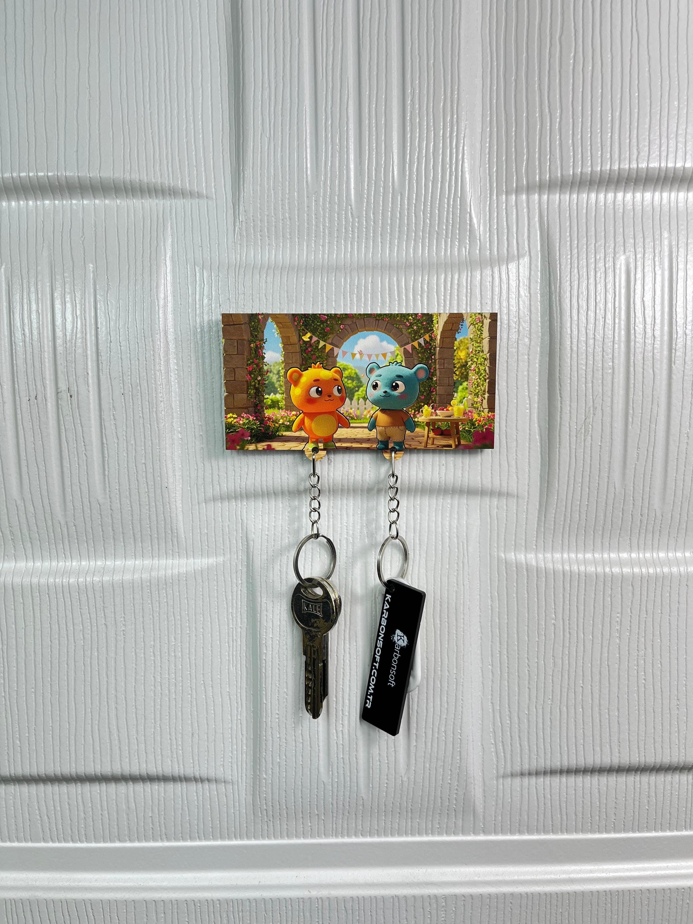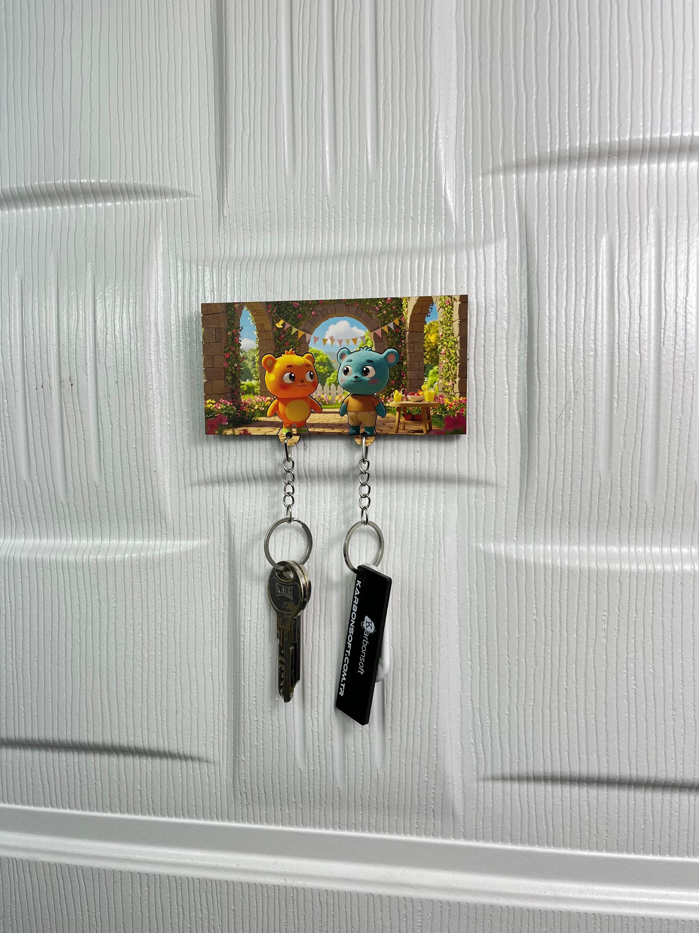 Meet the most adorable bear duo ever! 🧡💙 This handcrafted wooden key holder features two charming bear-like characters surrounded by floral arches and cheerful vibes. Perfect for nurseries, kids' rooms, or families who love colorful, happy designs.