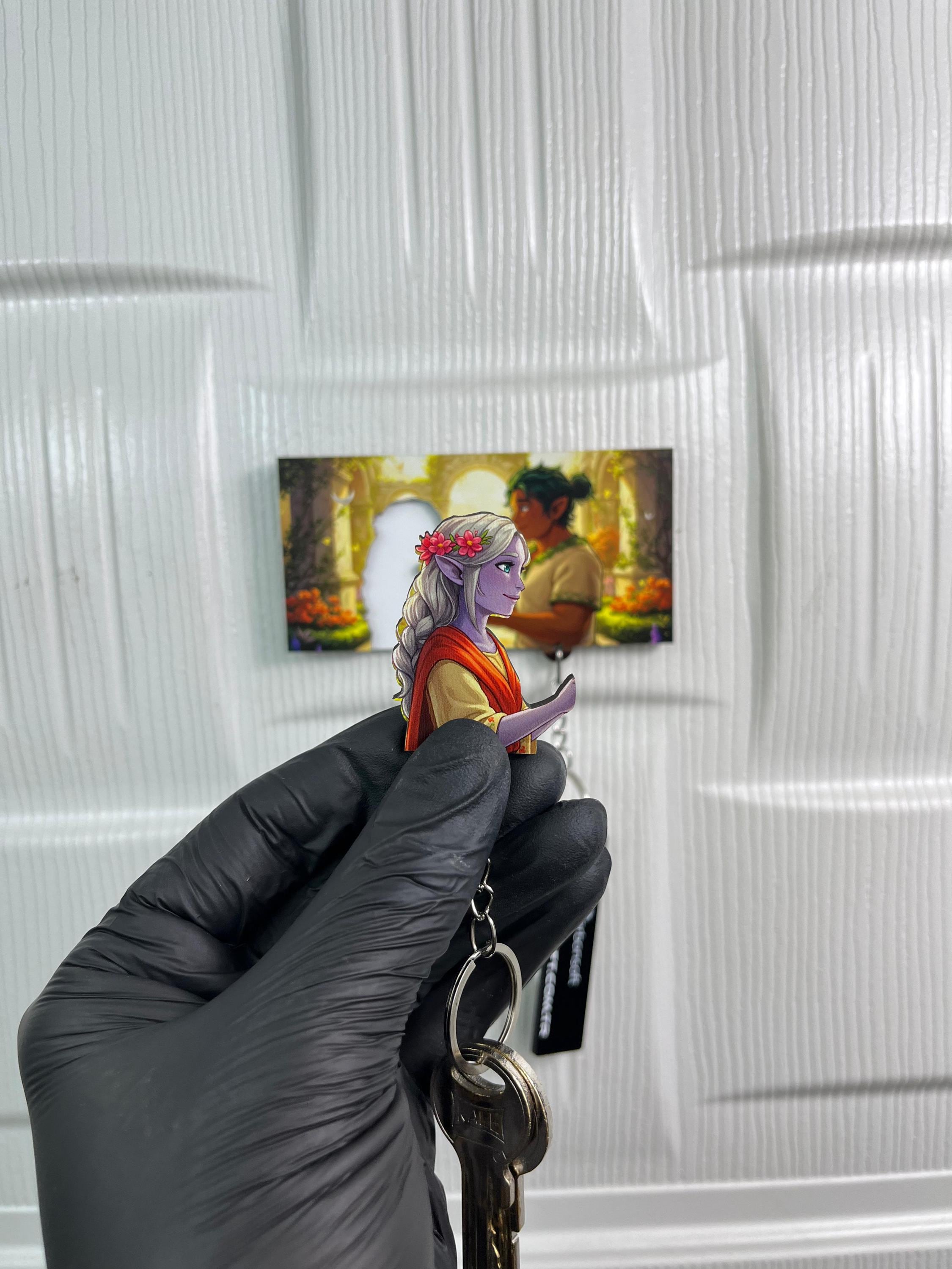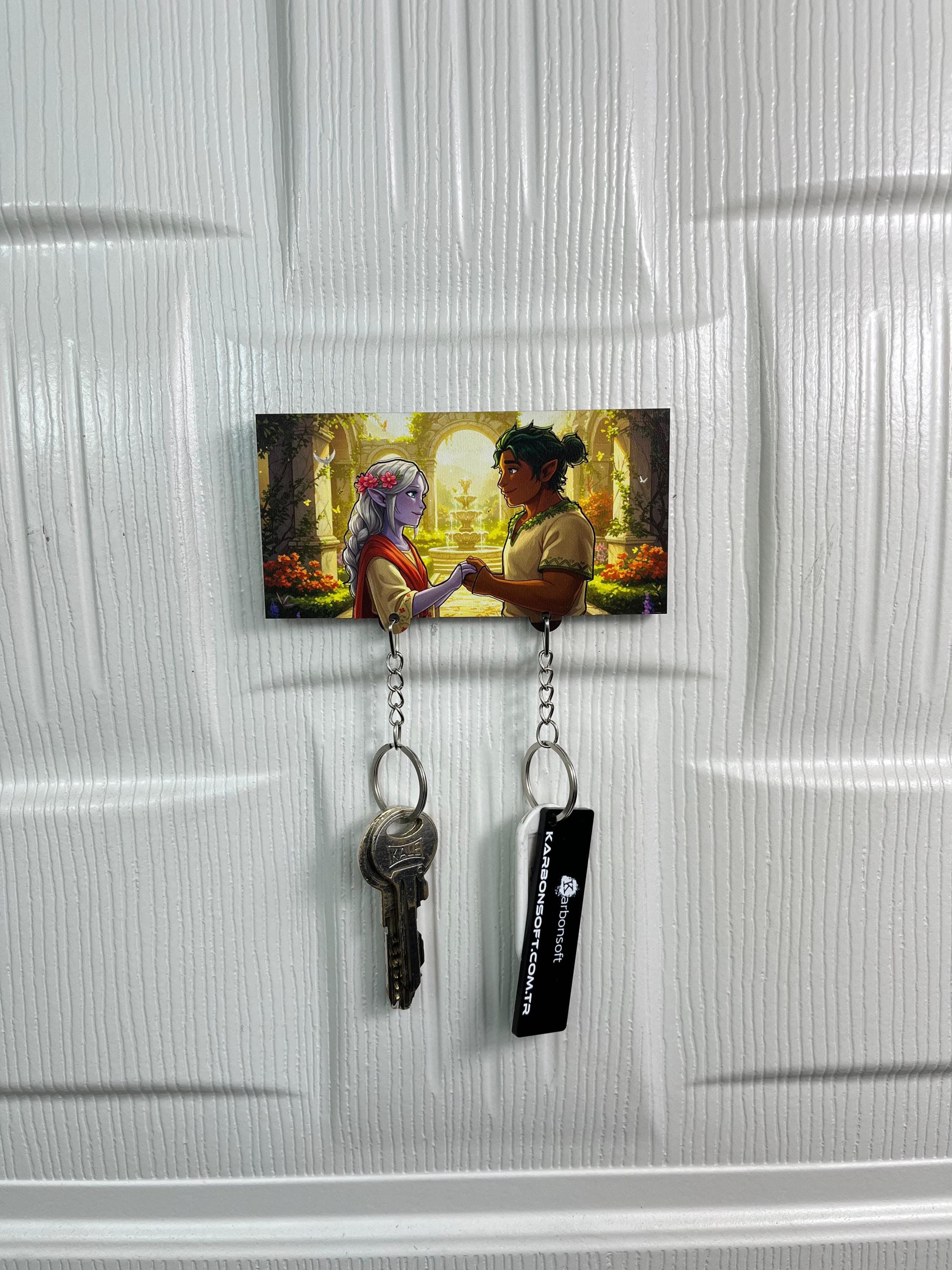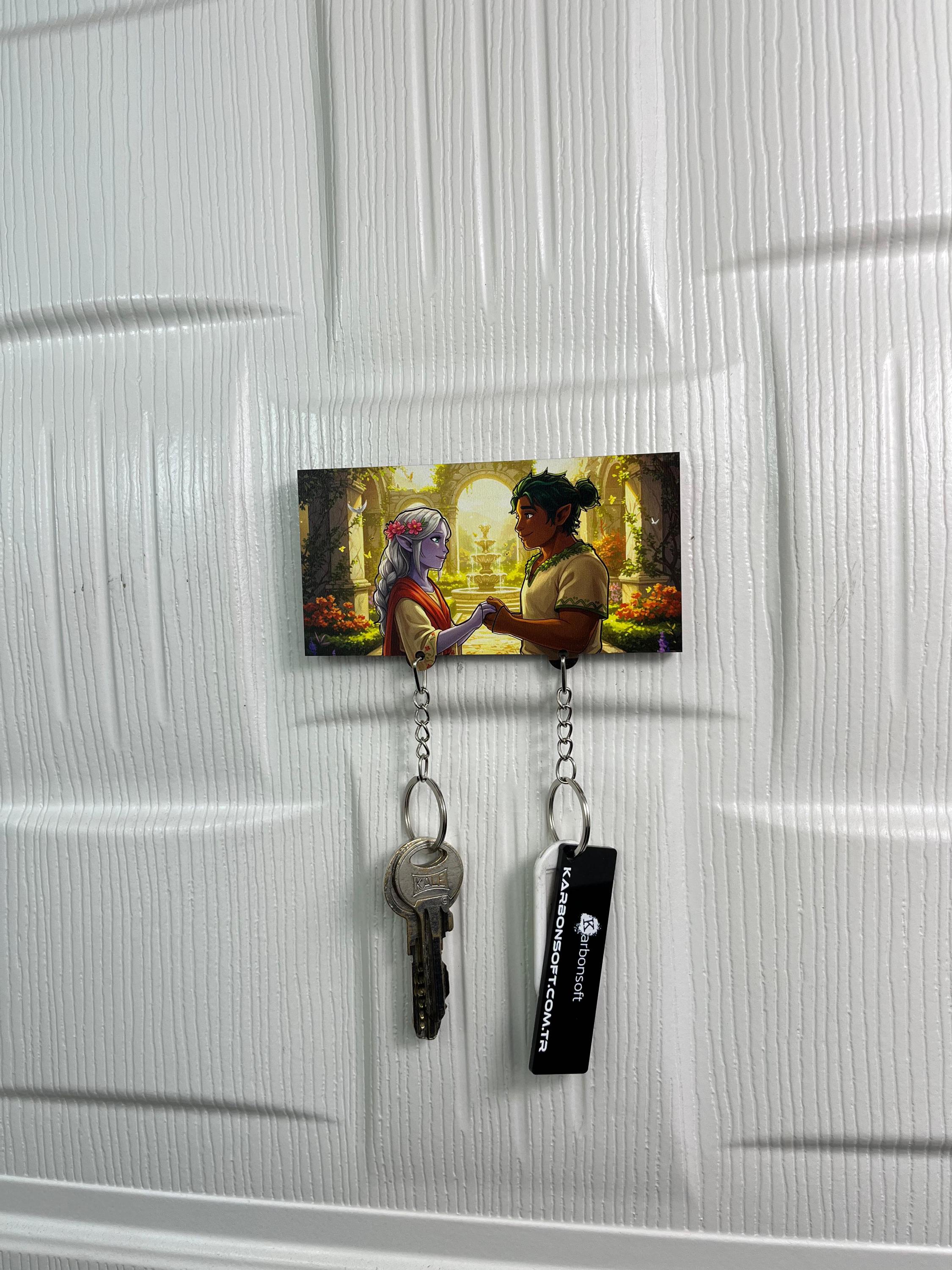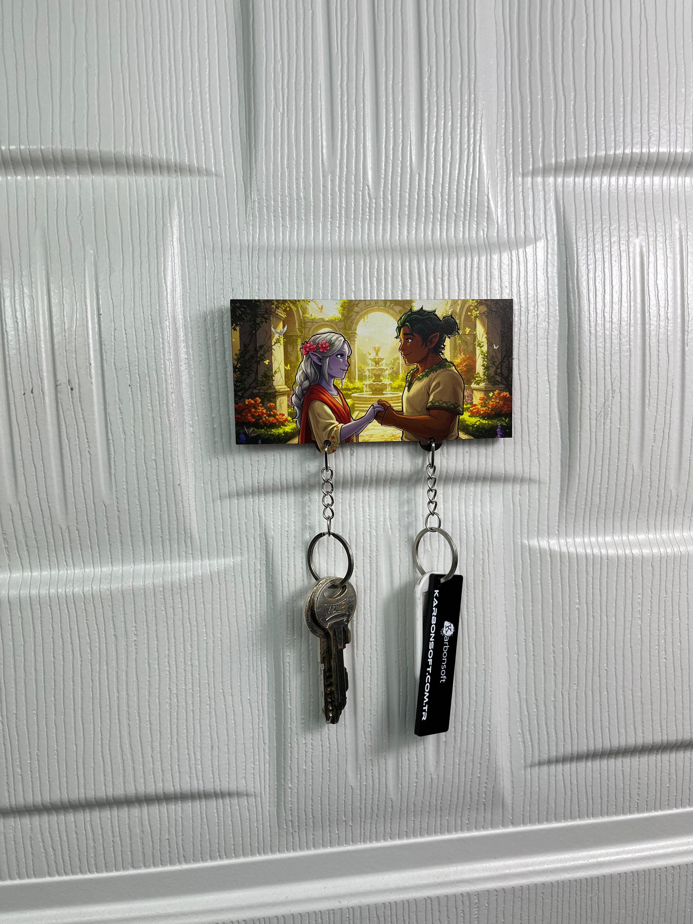 Step into a world of enchantment where love transcends realms 🌿💫 This handmade wooden key holder depicts a romantic moment between two magical characters in a blooming elven garden. A perfect piece for fantasy lovers and dreamers at heart.