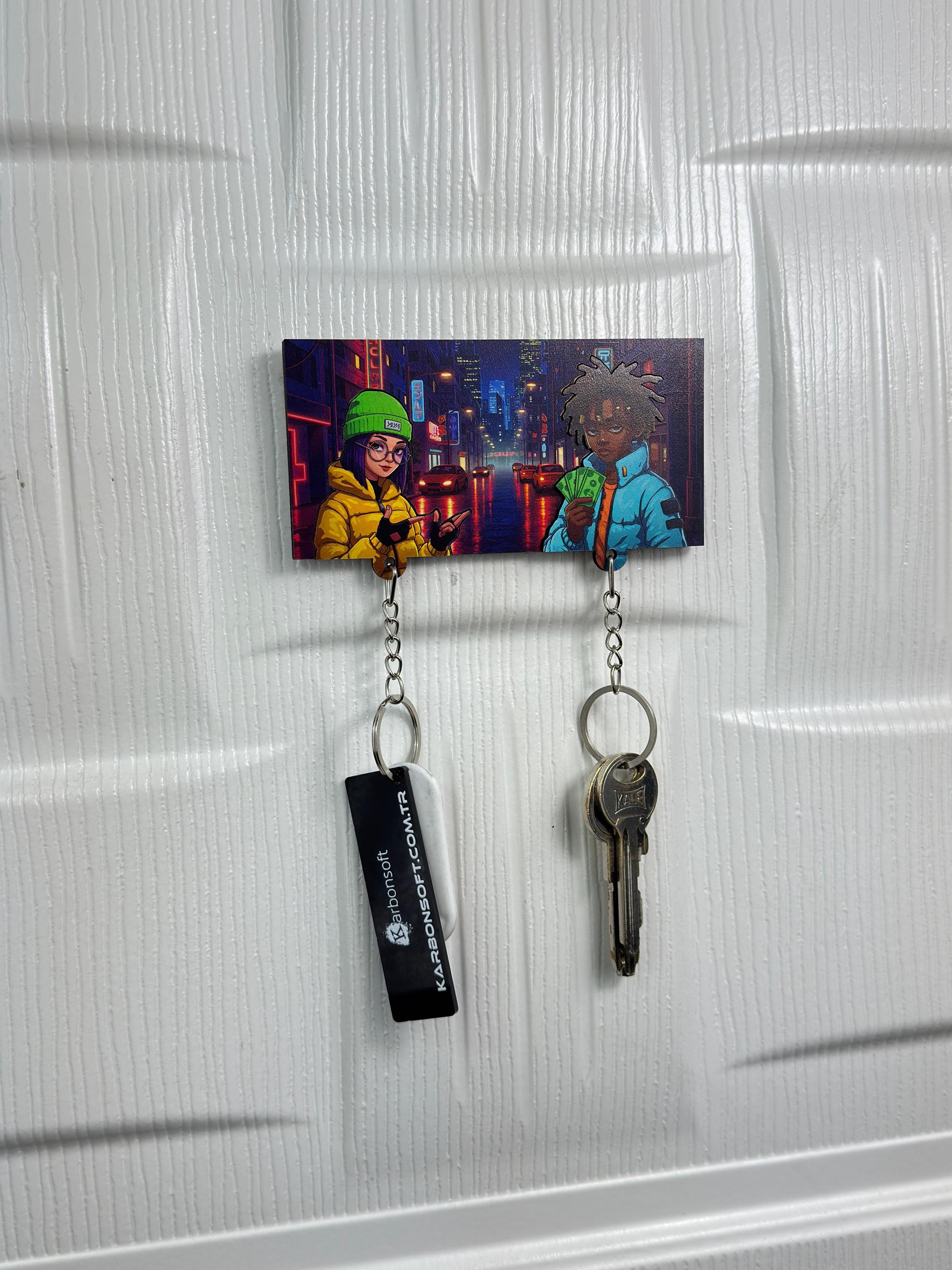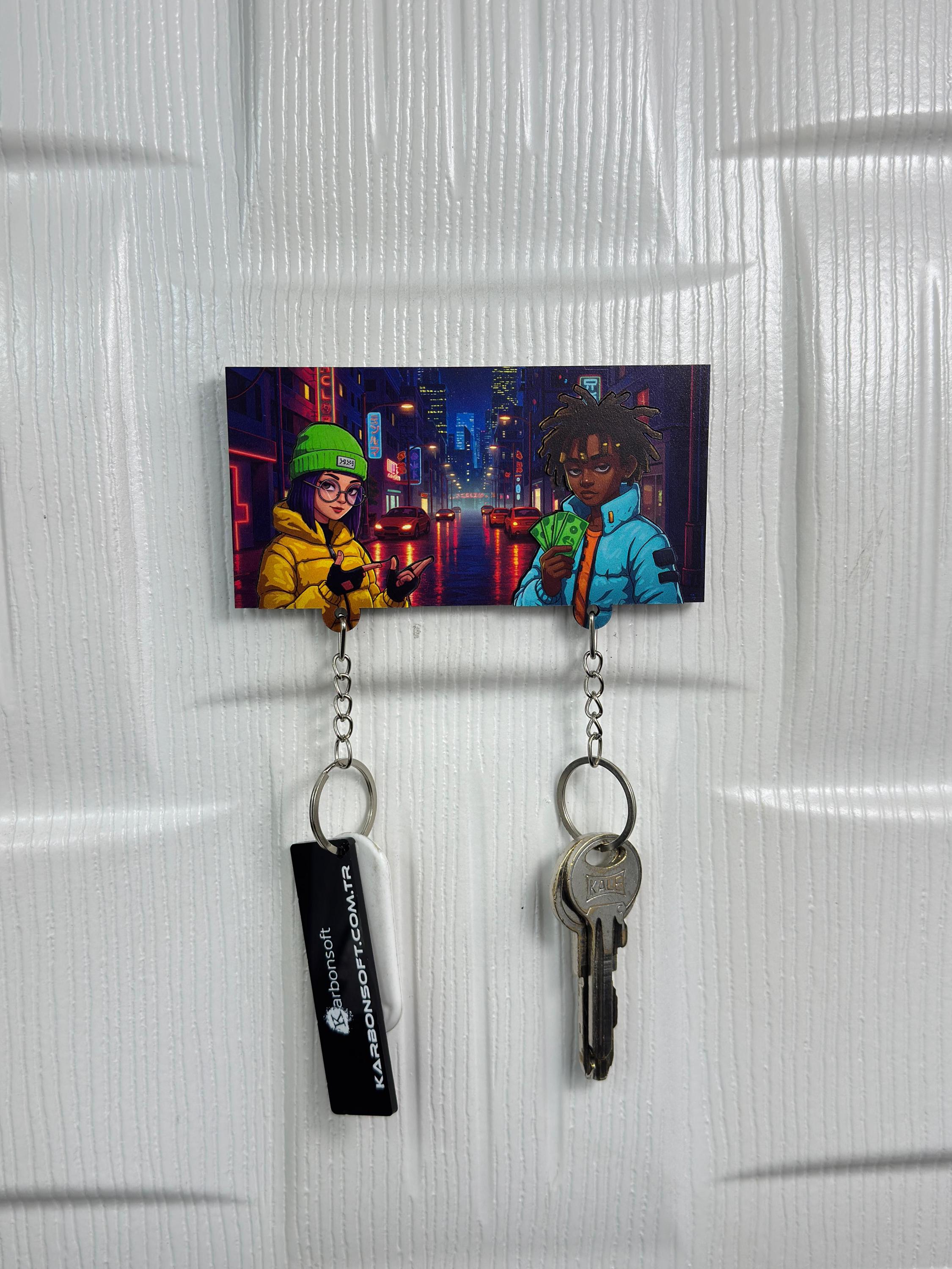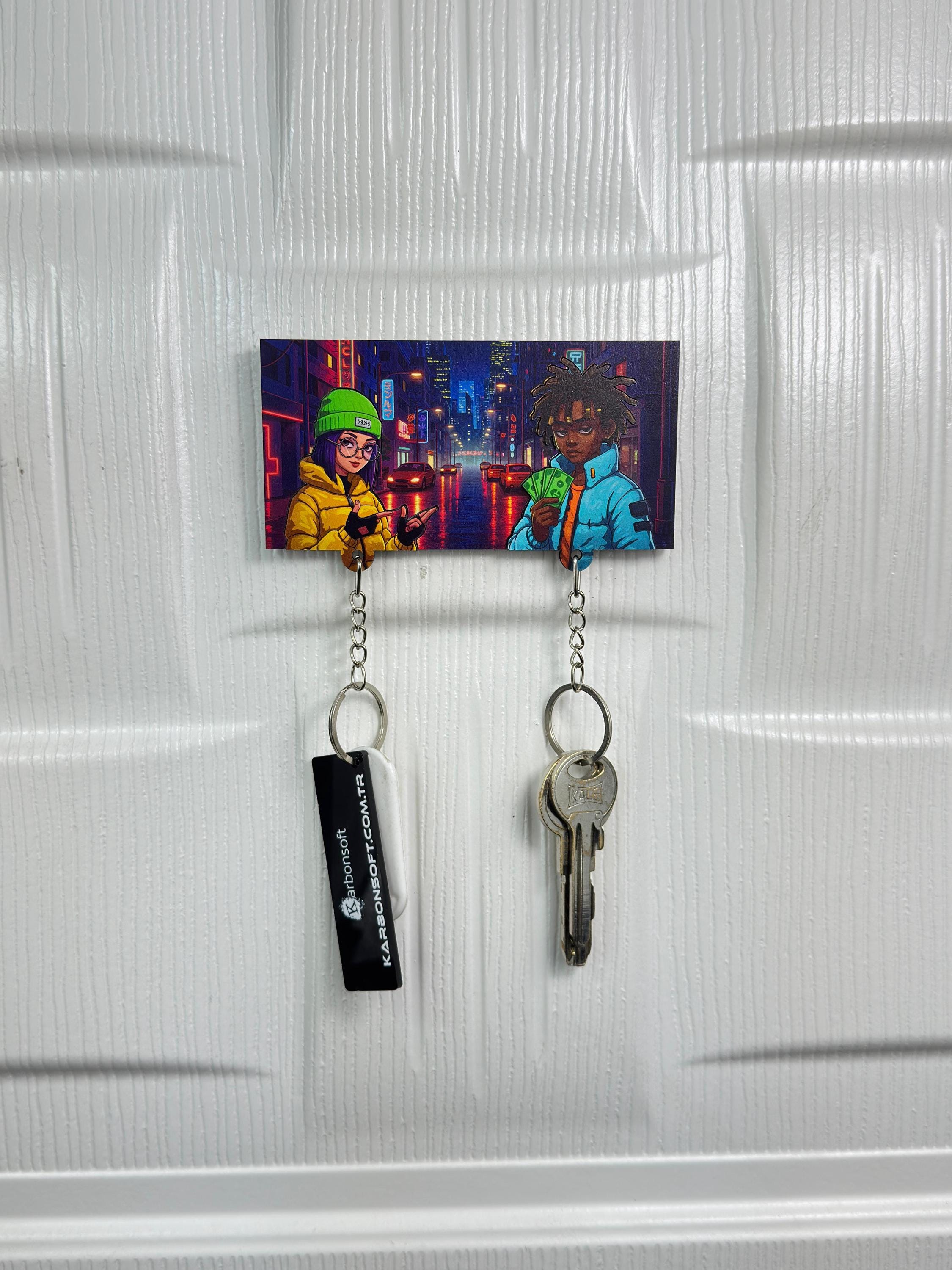 Bring a bold urban vibe into your space with this Urban Street Couple Wooden Key Holder 🔥 Set in a neon-lit city night, this vibrant key rack features two cool, stylish characters that radiate attitude, style, and creativity.