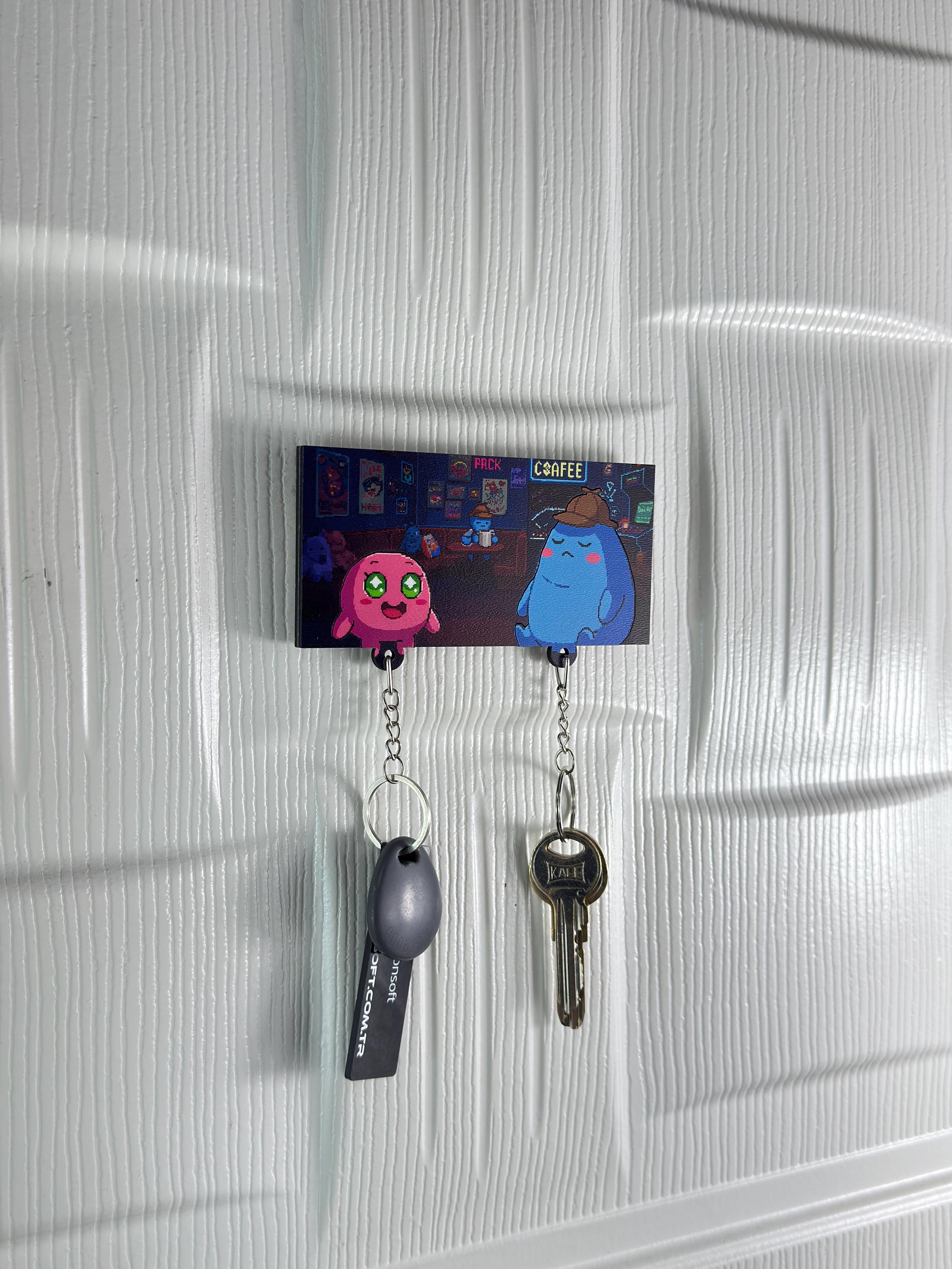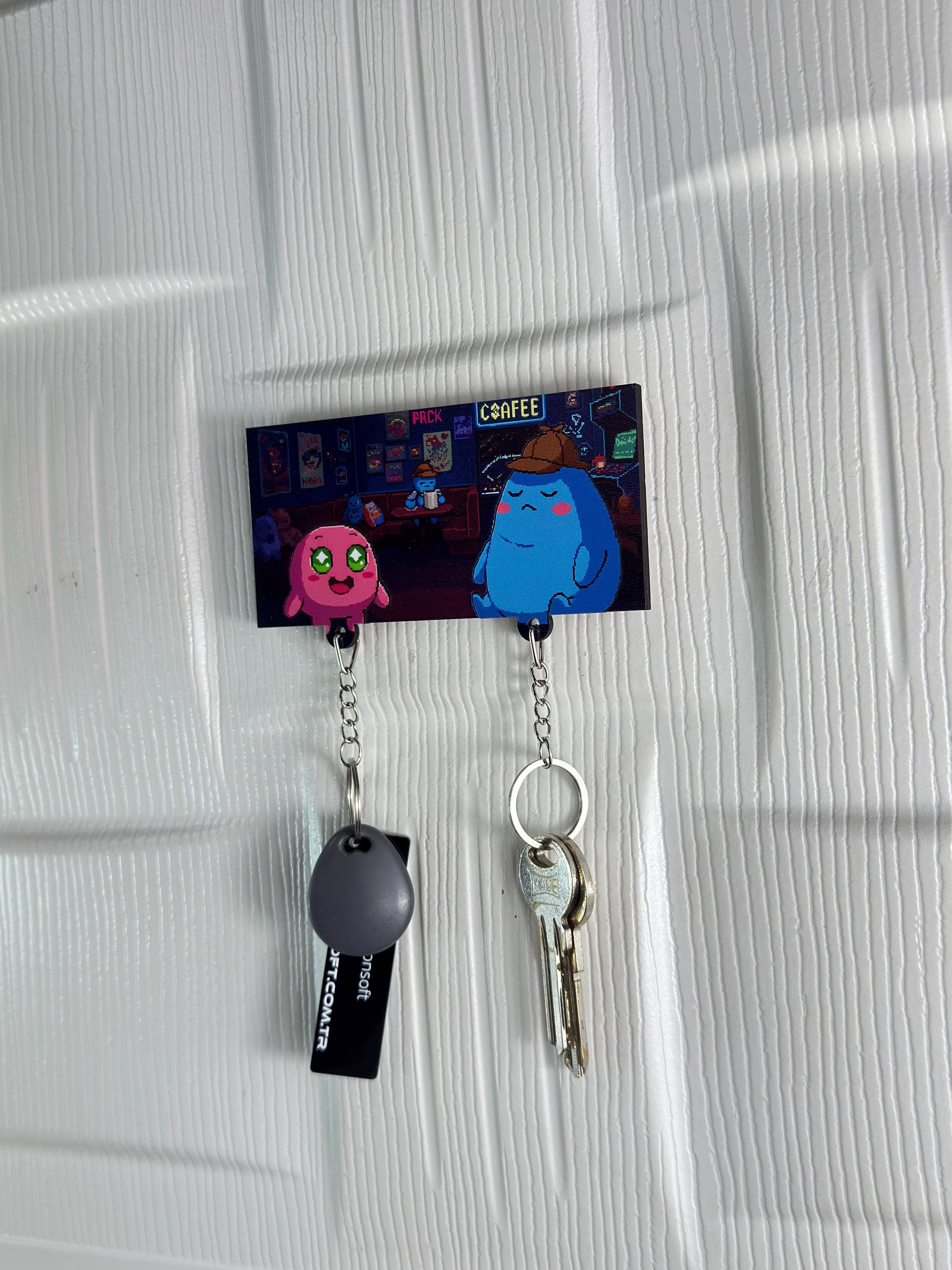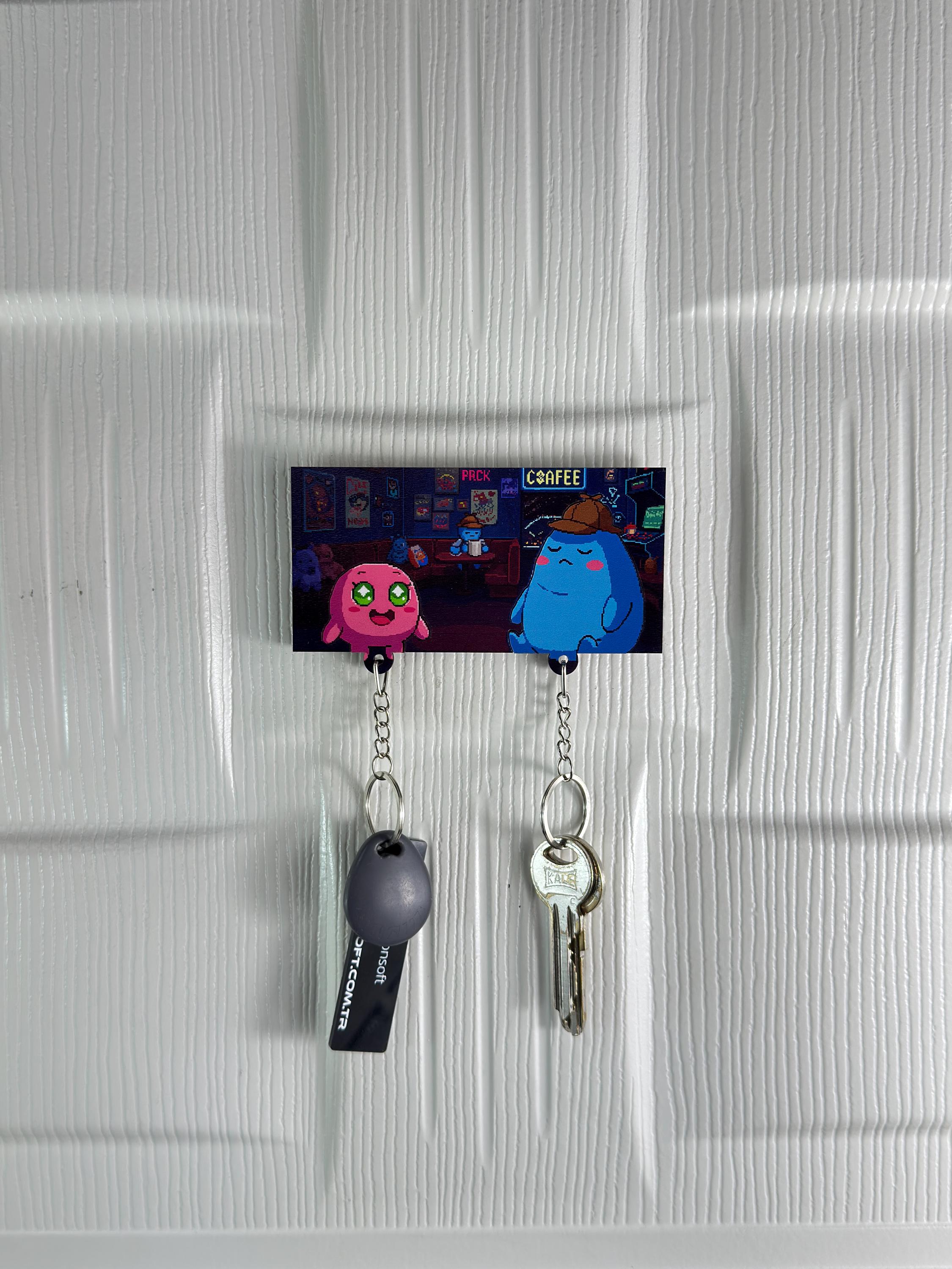 Brighten up your wall with a splash of cuteness! 💖💙 This Cute Cartoon Couple Key Holder features an adorable duo – a wide-eyed pink cutie and a sleepy blue blob – hanging out in a cozy coffee shop scene. Perfect for couples who love coffee dates, cozy vibes, and cartoon aesthetics.
