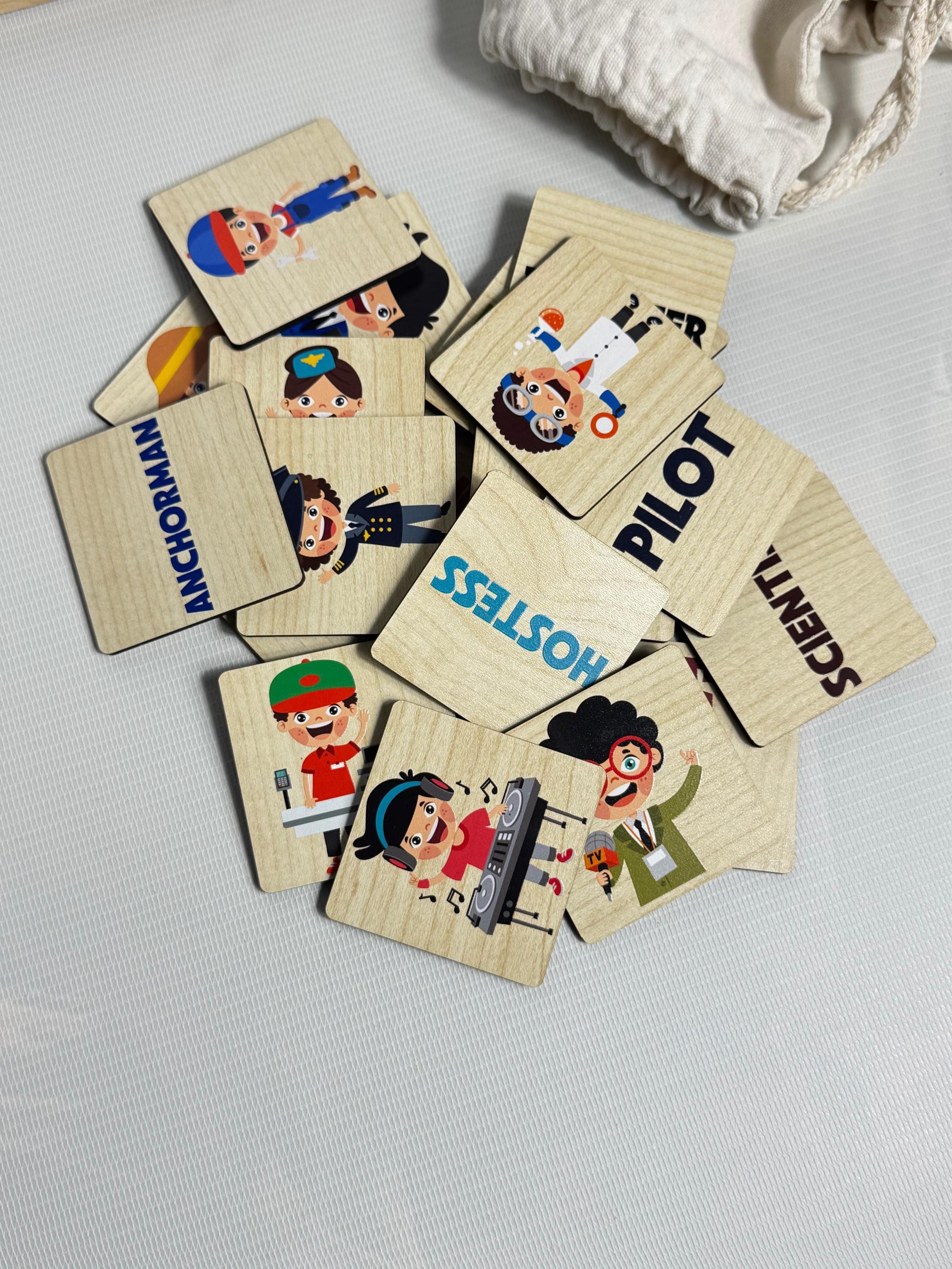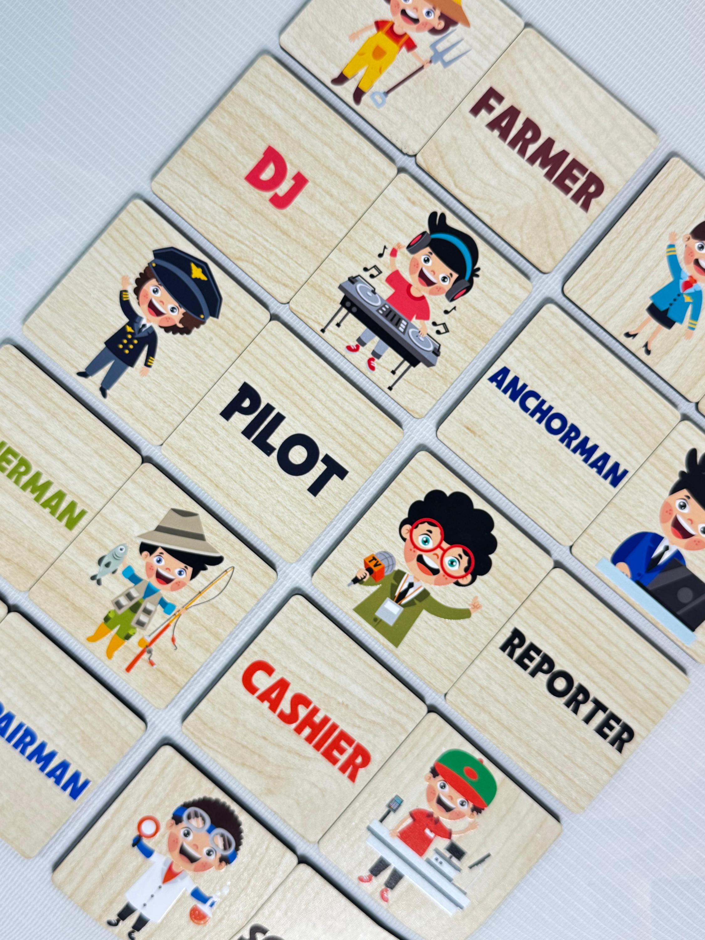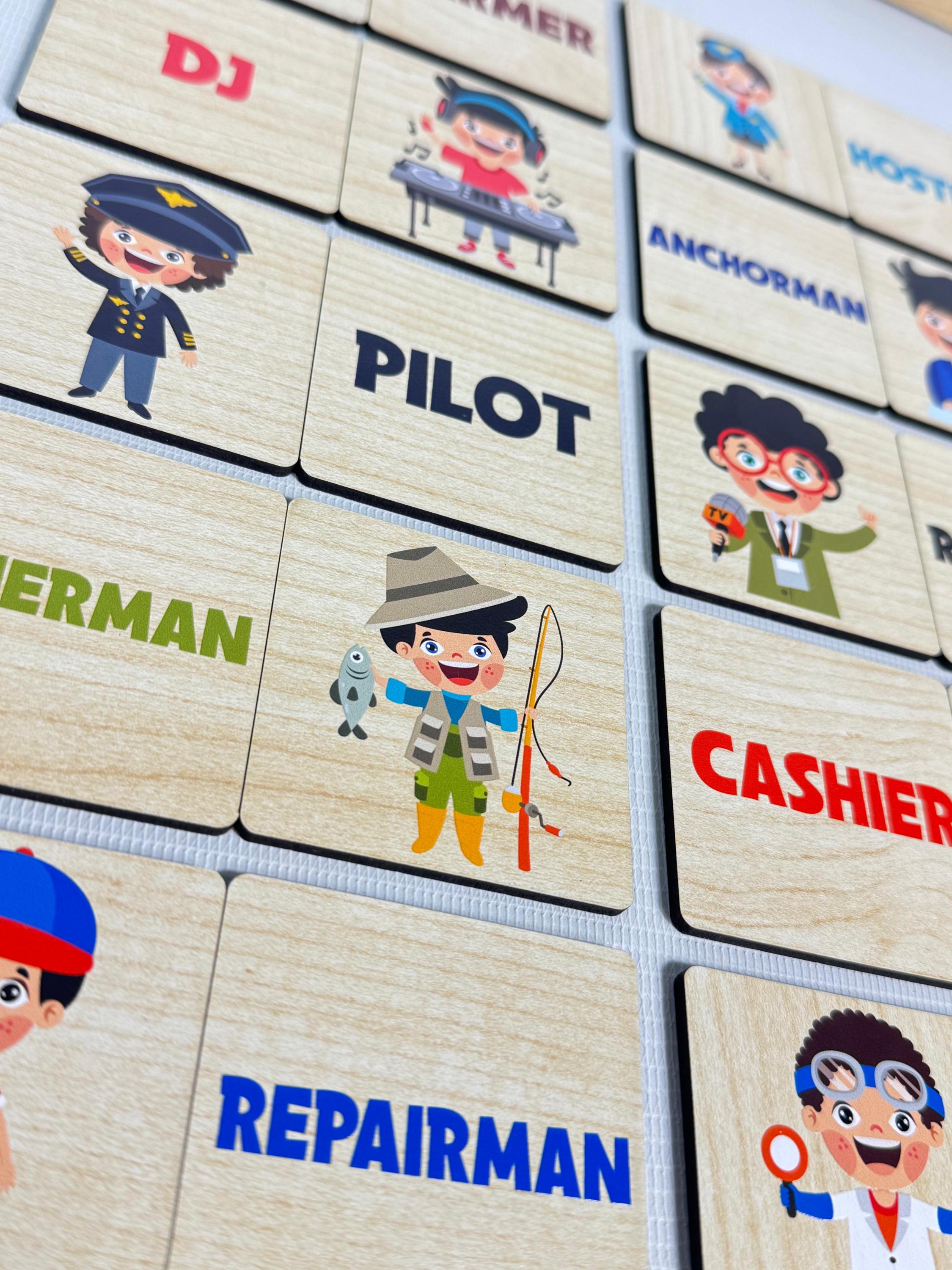 Each card displays a colorful illustration of a profession and its matching name, encouraging kids to enhance their memory, vocabulary, and cognitive skills in a playful way.