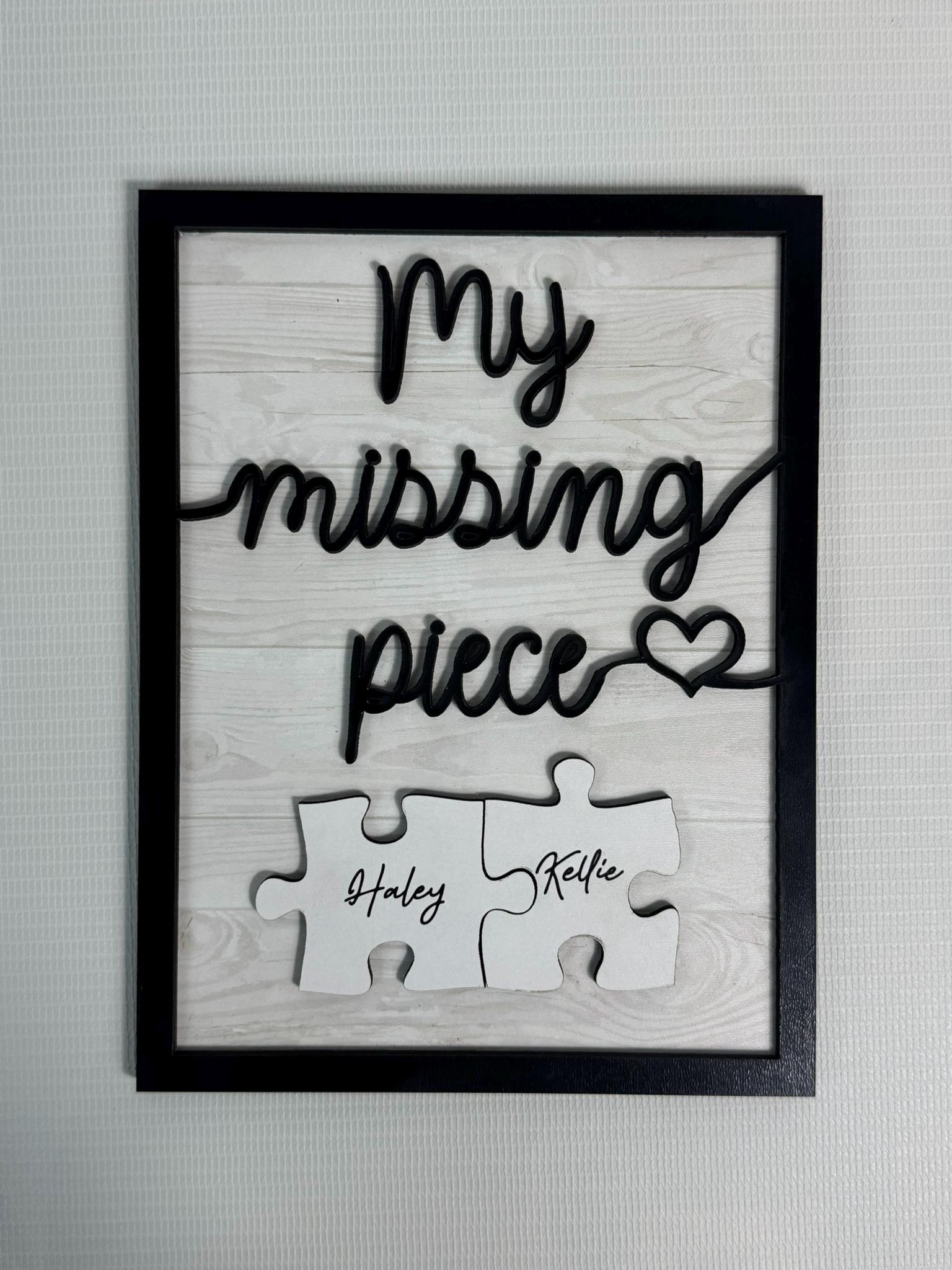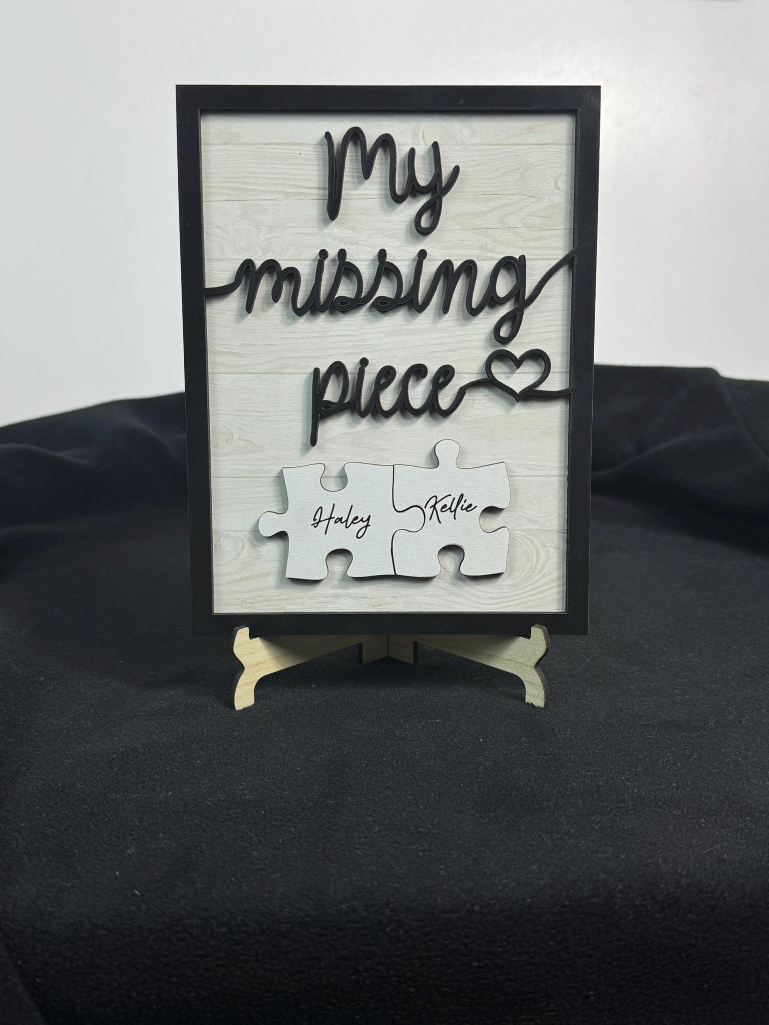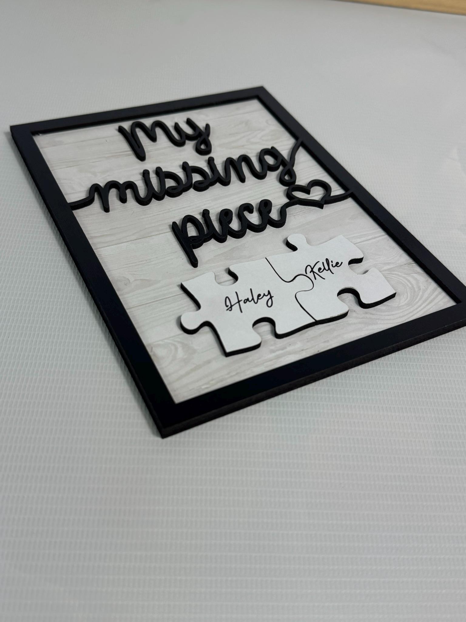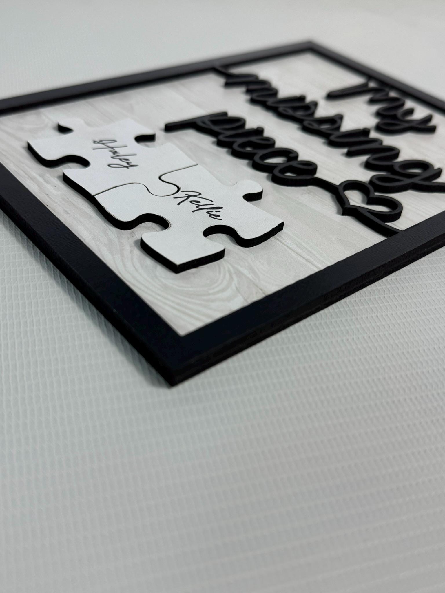 This exquisite sign features an elegant black frame and dimensional script that reads "My Missing Piece." What makes it truly special is the interlocking puzzle pieces beneath the lettering, engraved with both your names, signifying the unbreakable bond between you and your partner.