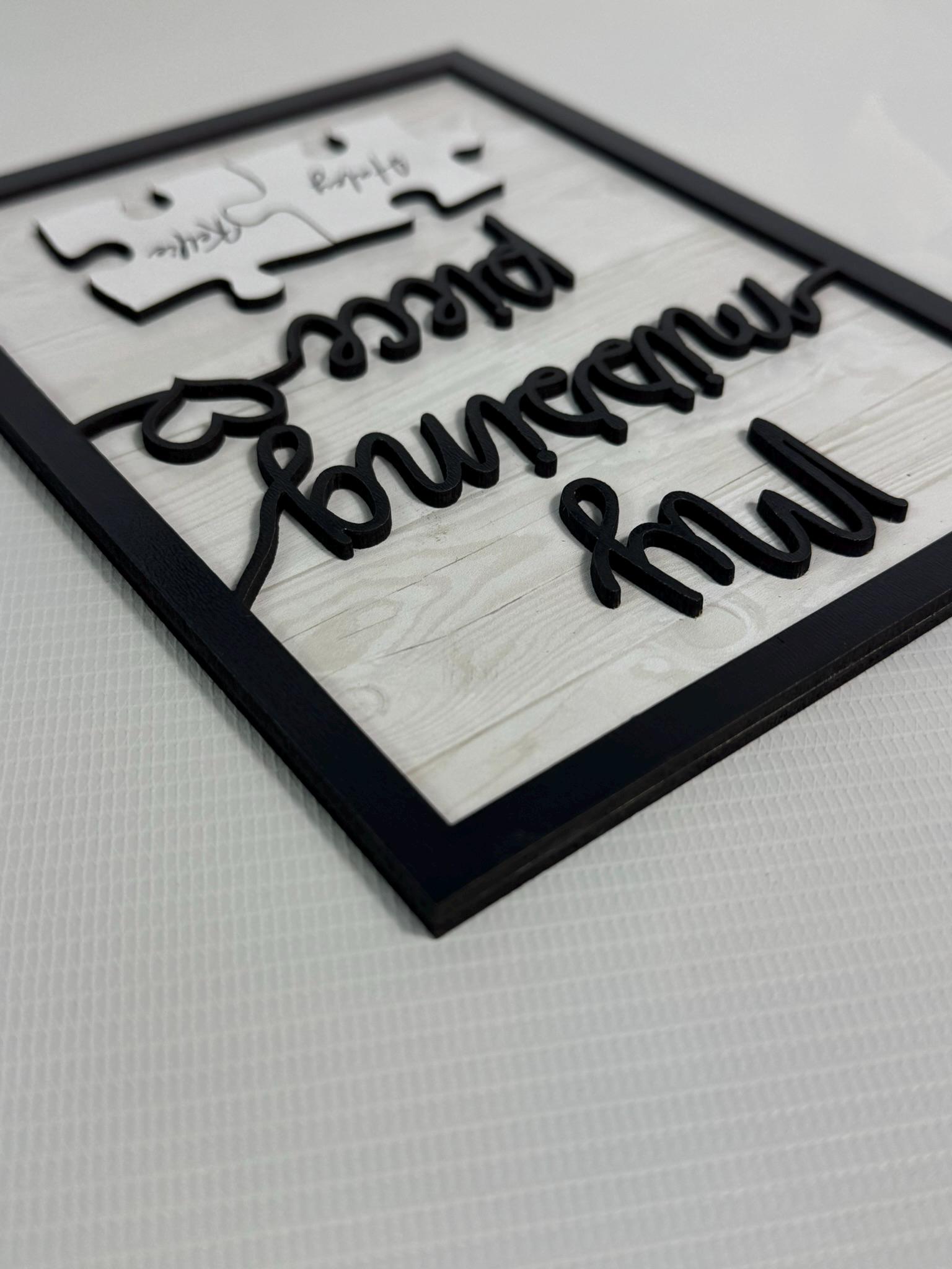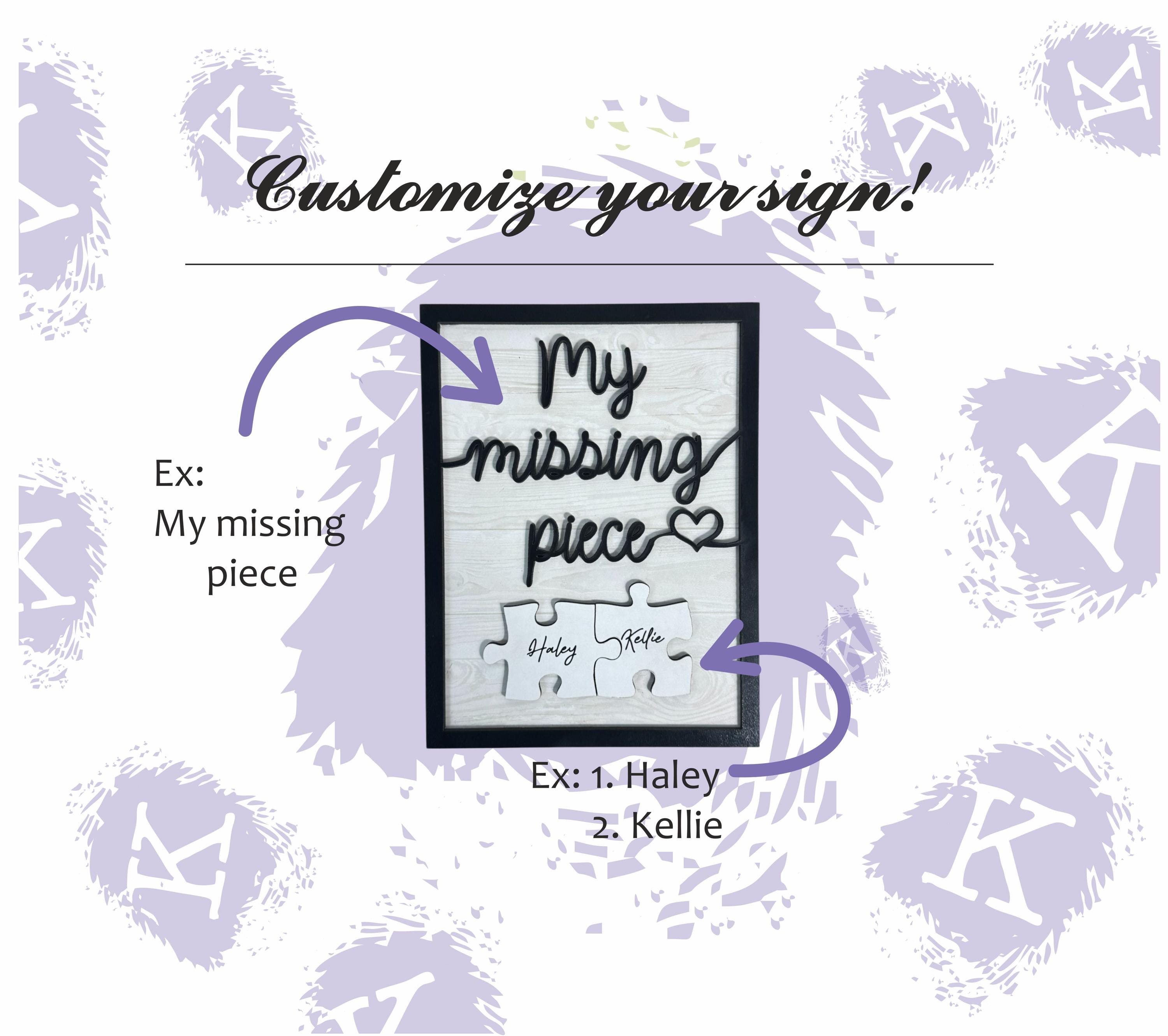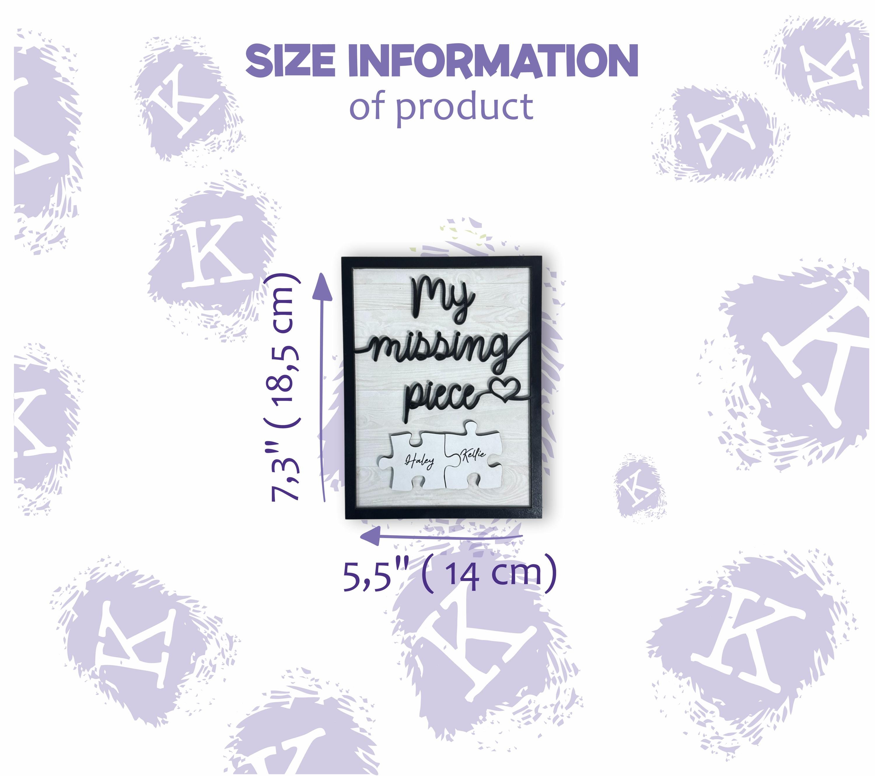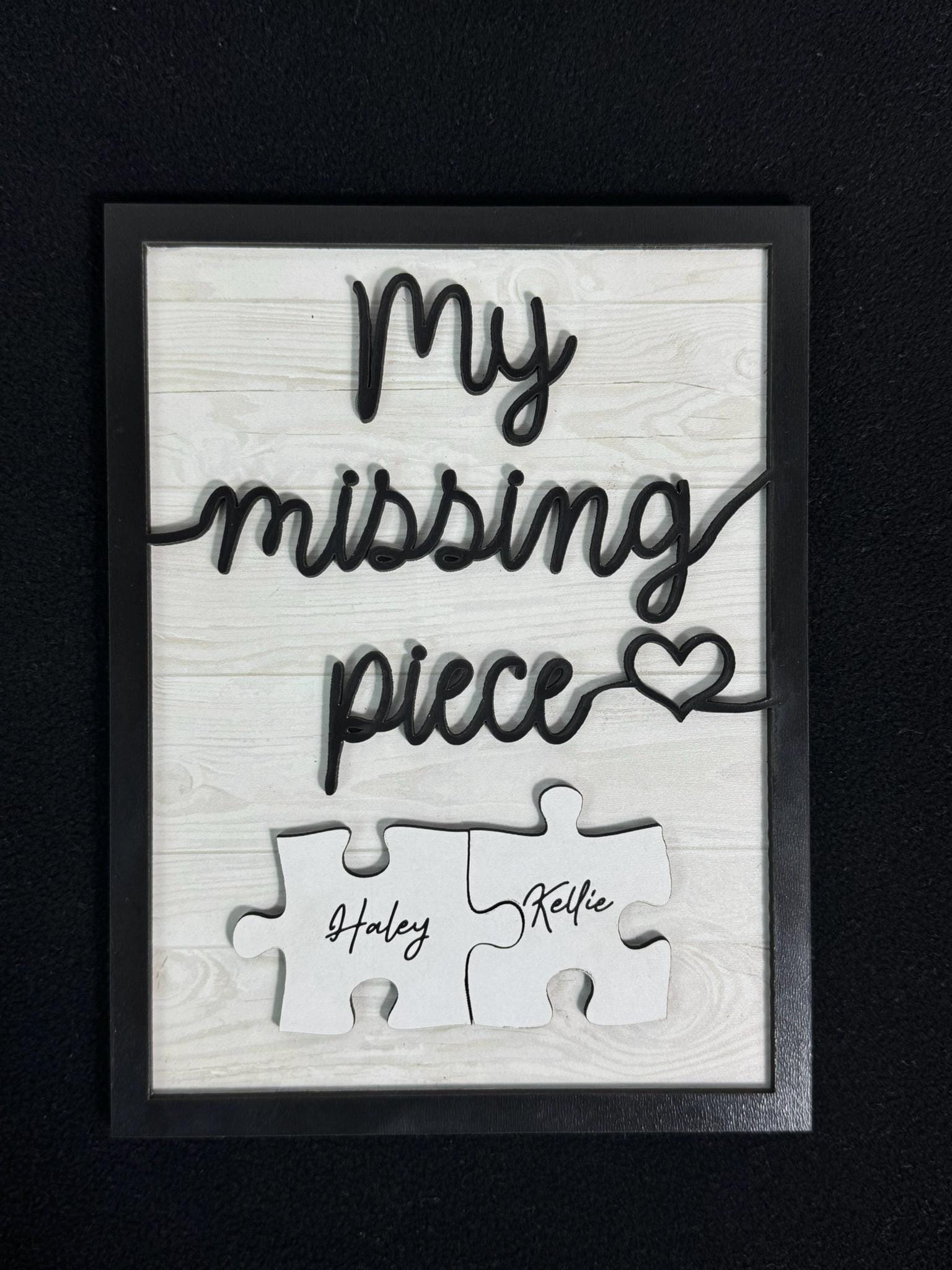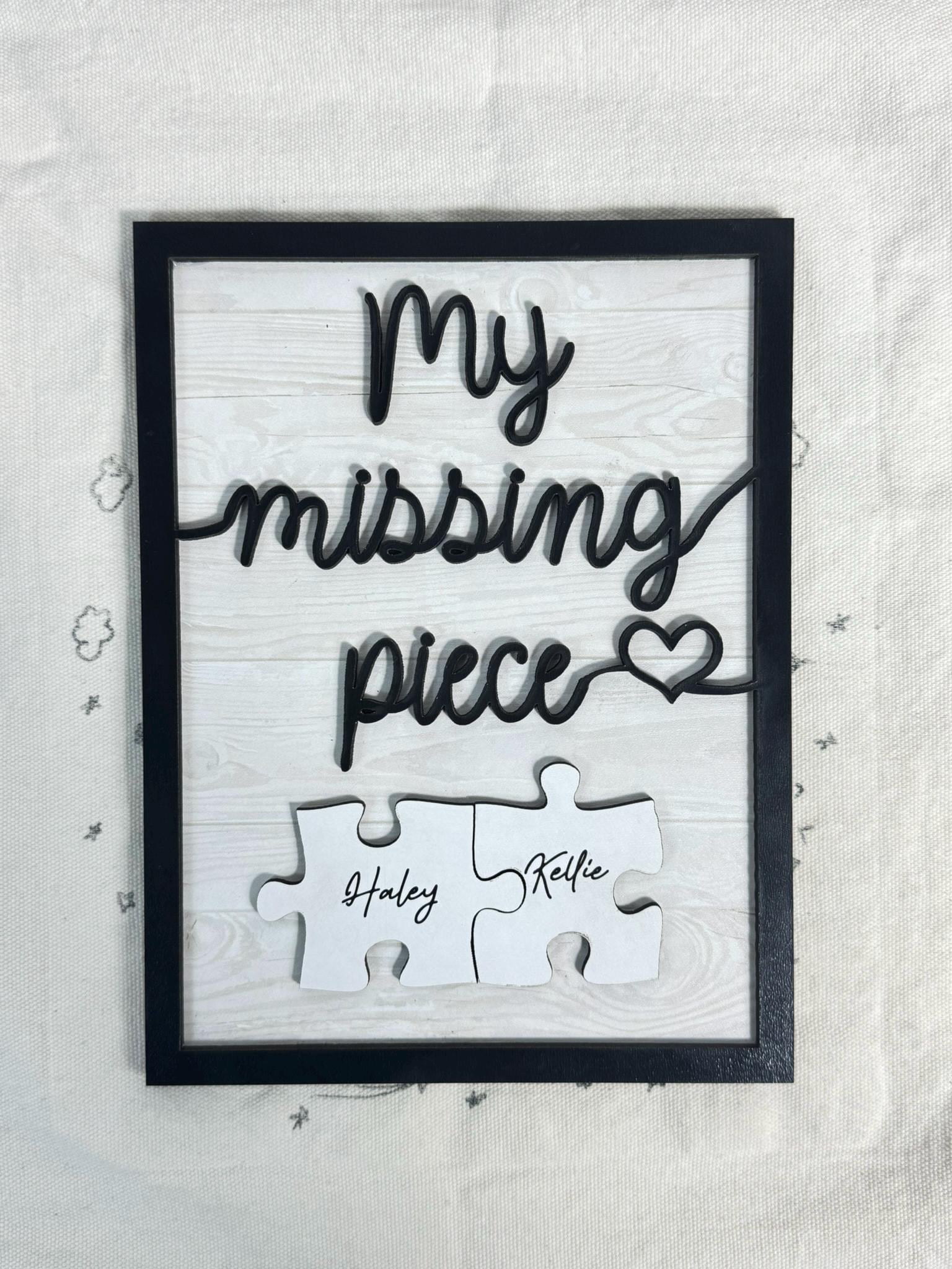 This exquisite sign features an elegant black frame and dimensional script that reads "My Missing Piece." What makes it truly special is the interlocking puzzle pieces beneath the lettering, engraved with both your names, signifying the unbreakable bond between you and your partner.