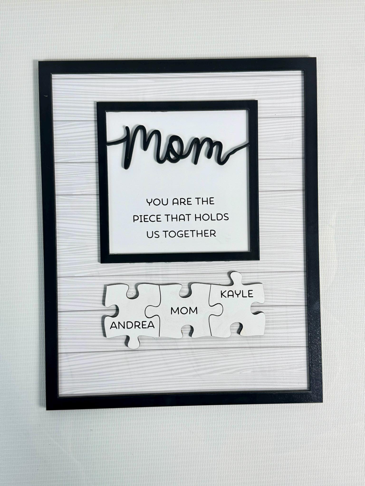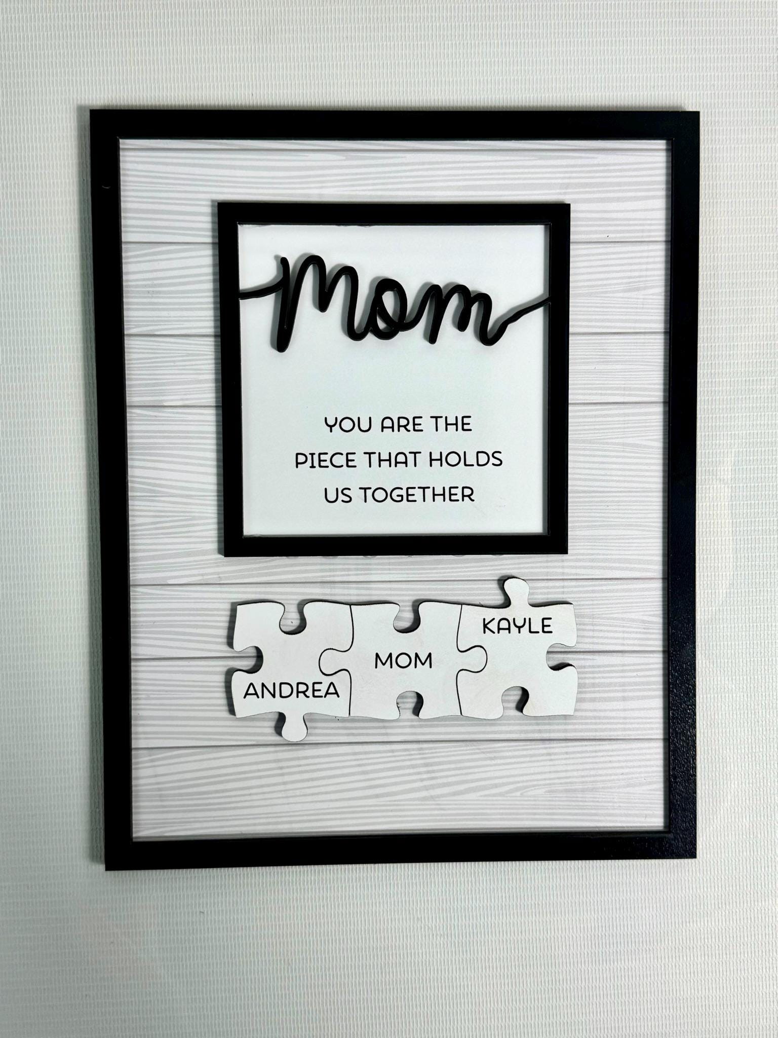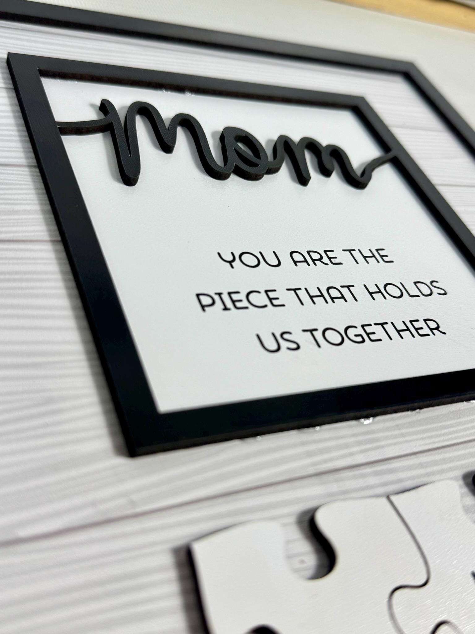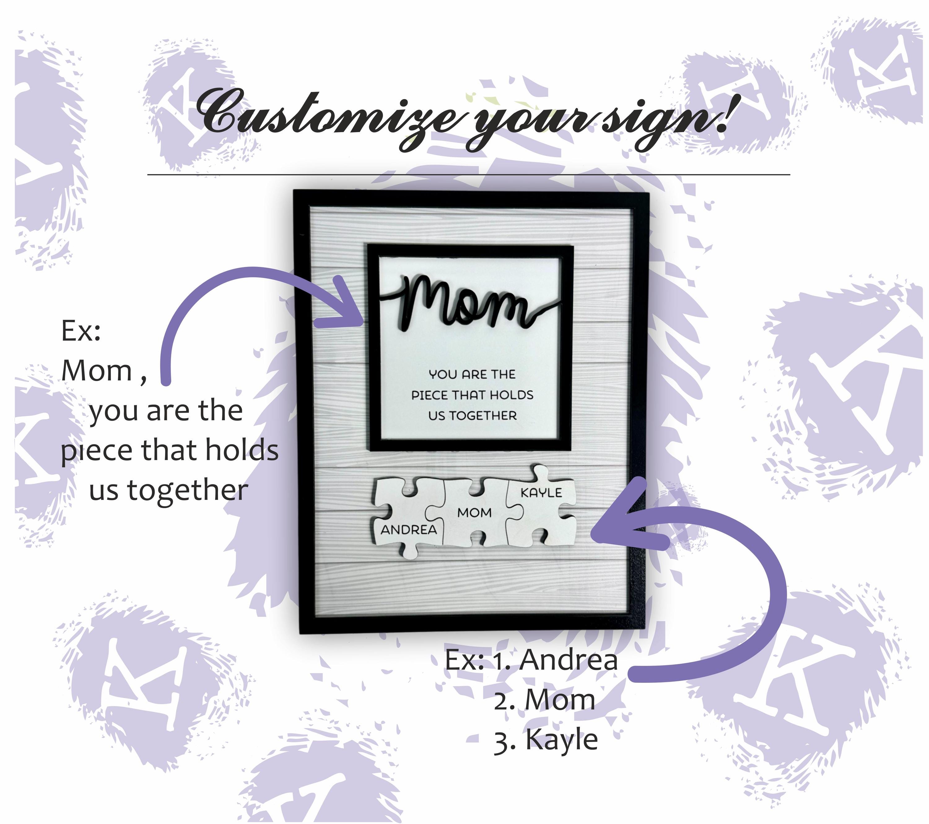 Celebrate the special bond you share with your mom with this custom puzzle sign, designed to show her just how much she means to the family! Featuring the heartfelt message "You are the piece that holds us together," this beautifully crafted sign is a unique and sentimental gift for Mother’s Day, birthdays, or any special occasion.