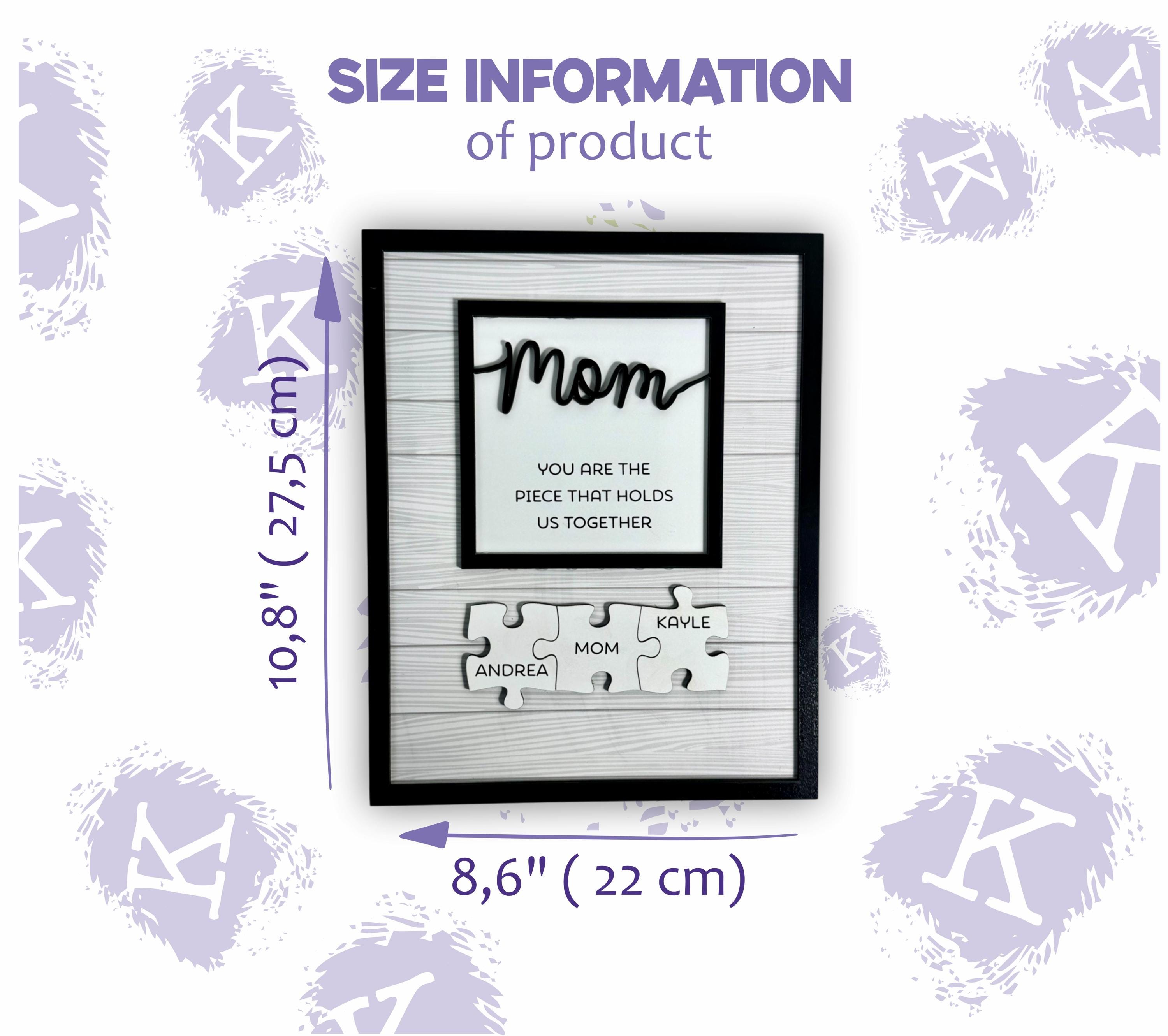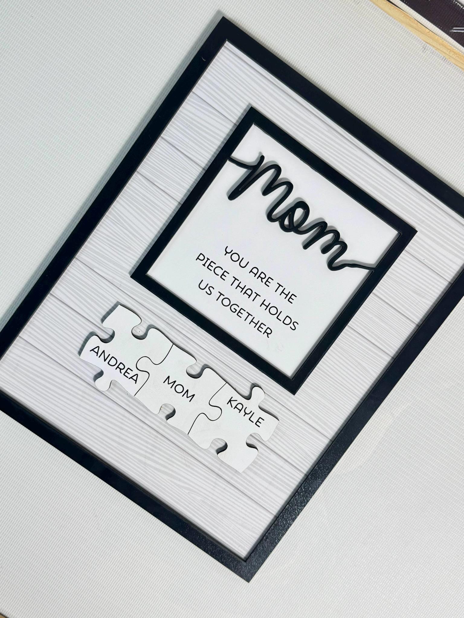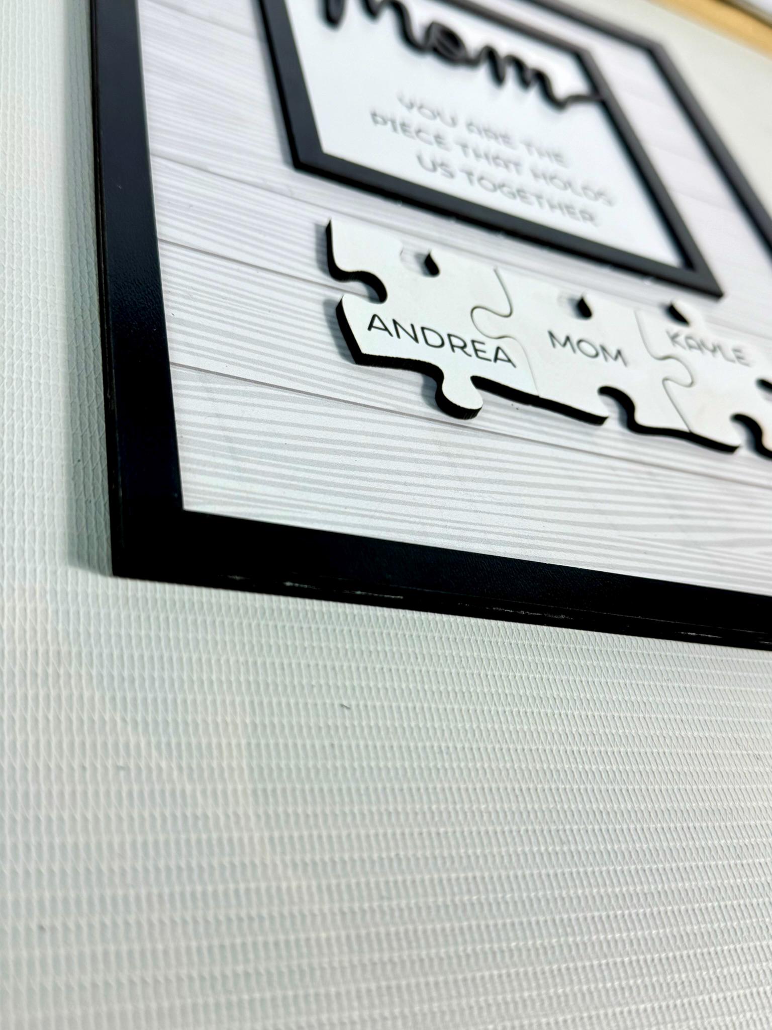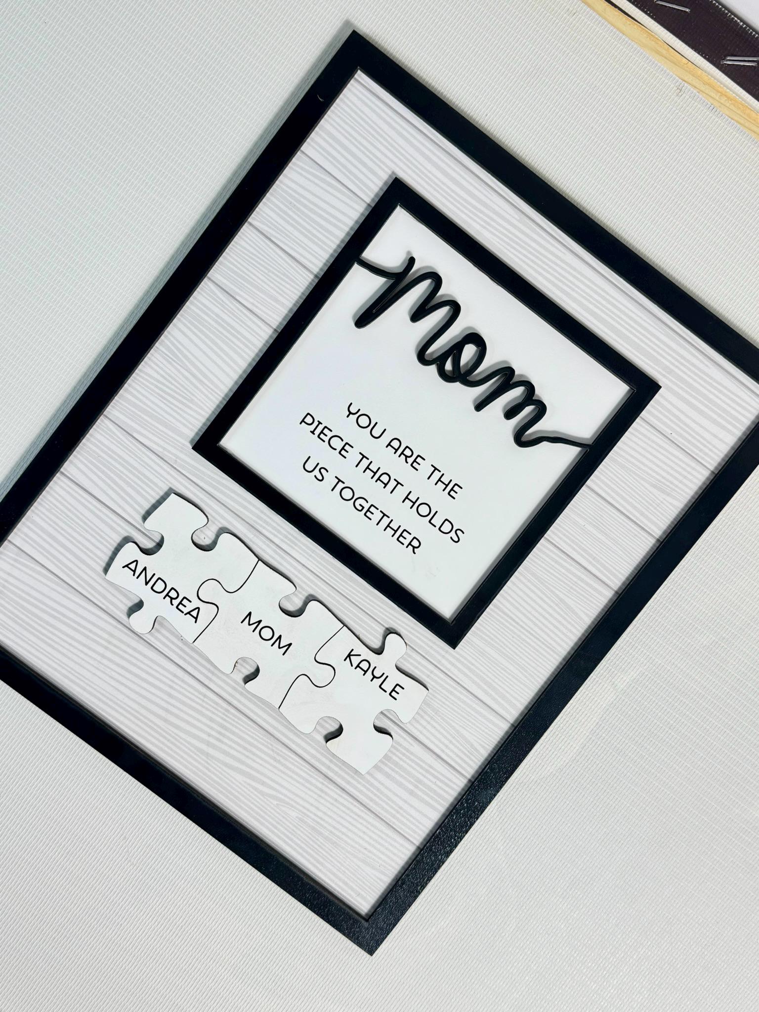 Celebrate the special bond you share with your mom with this custom puzzle sign, designed to show her just how much she means to the family! Featuring the heartfelt message "You are the piece that holds us together," this beautifully crafted sign is a unique and sentimental gift for Mother’s Day, birthdays, or any special occasion.