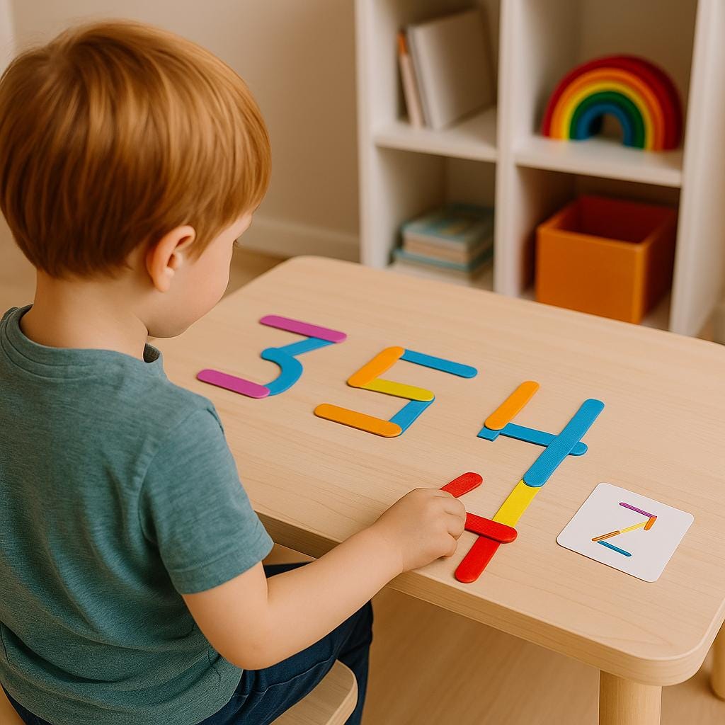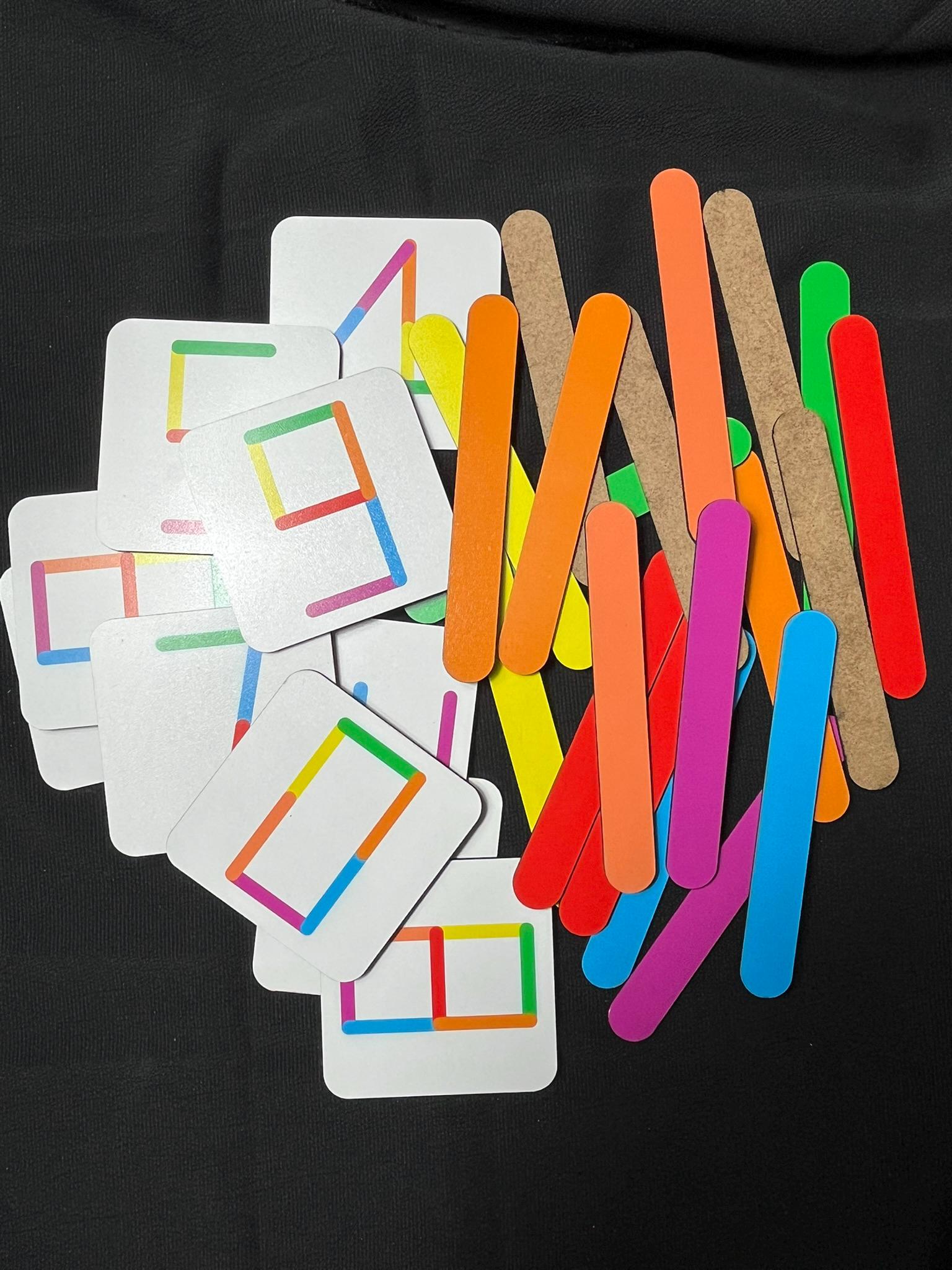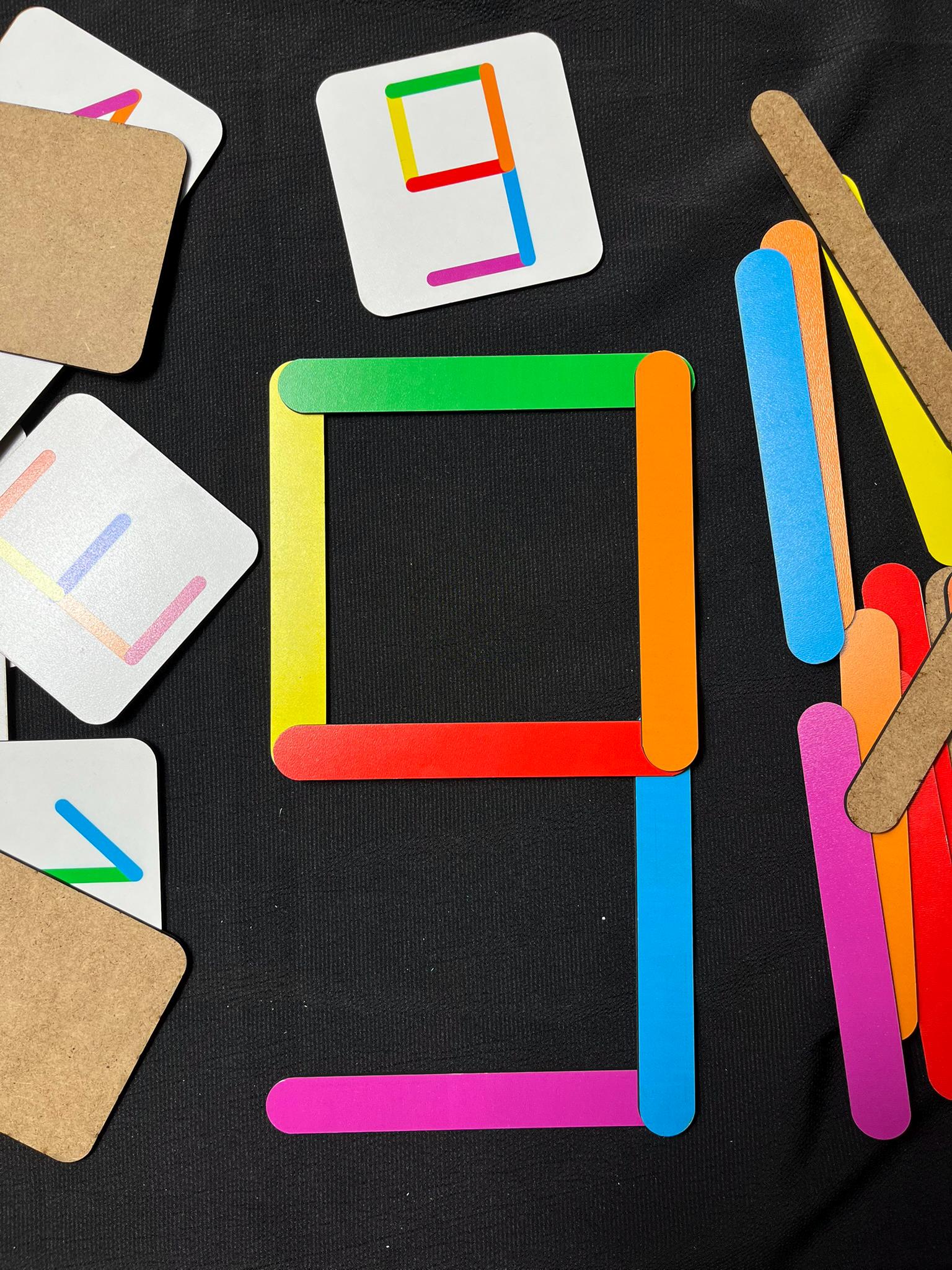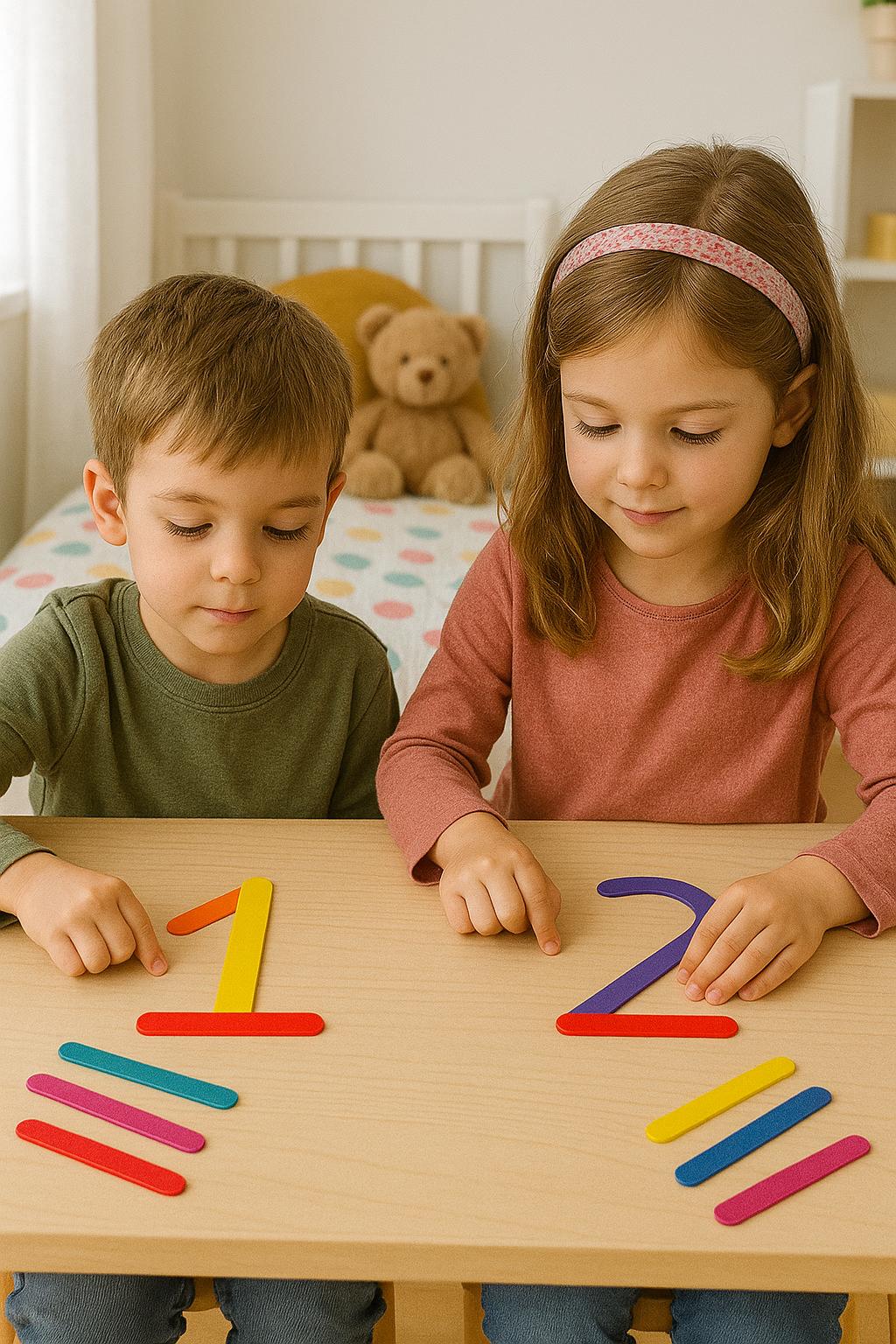 🎲 How to Play: Choose a number card. Use the colored sticks to replicate the number by matching the shape and colors on the card. Try building the number with different color combinations to boost creativity. For advanced play, ask your child to build numbers without looking at the cards!