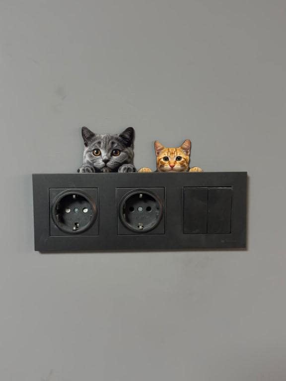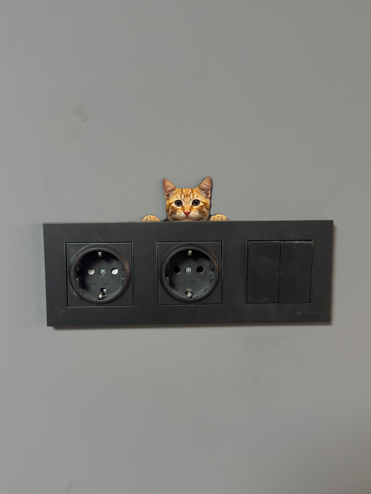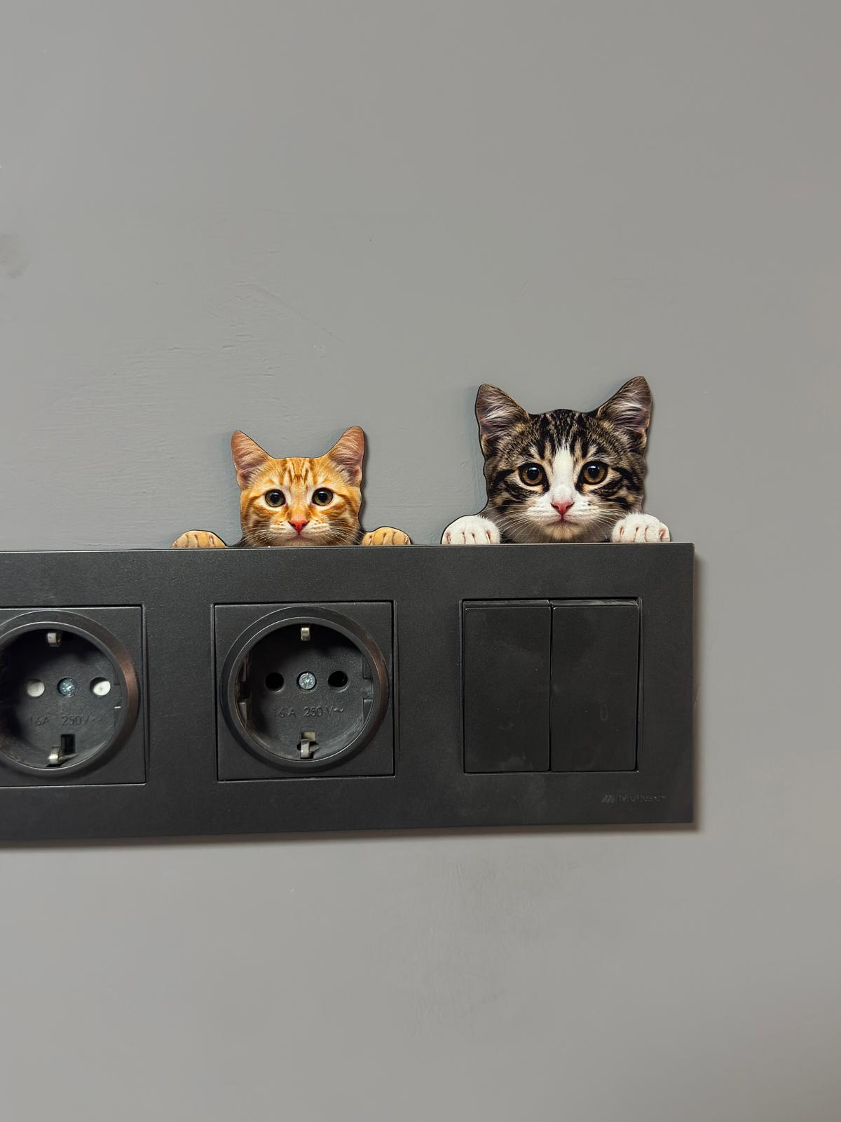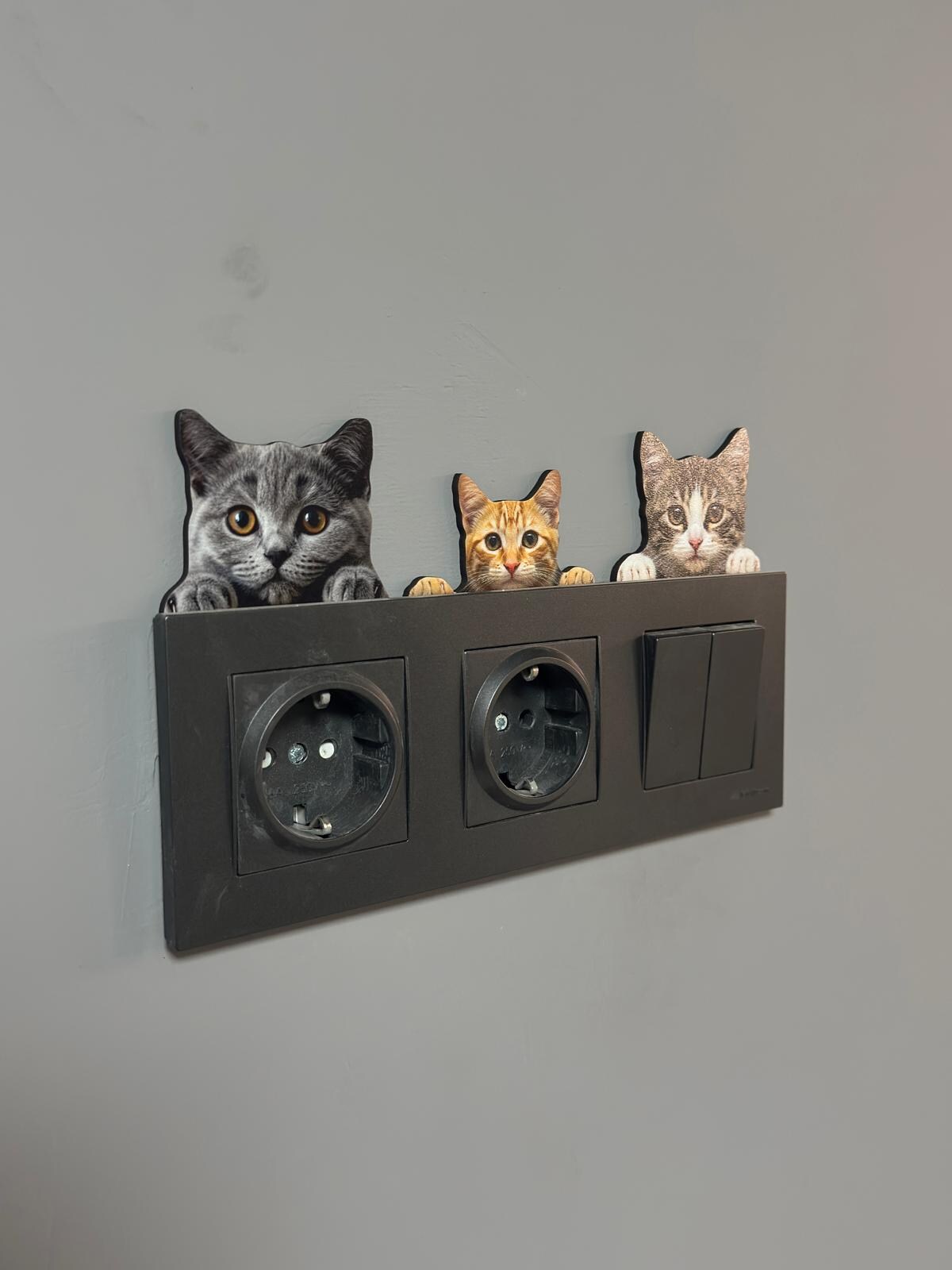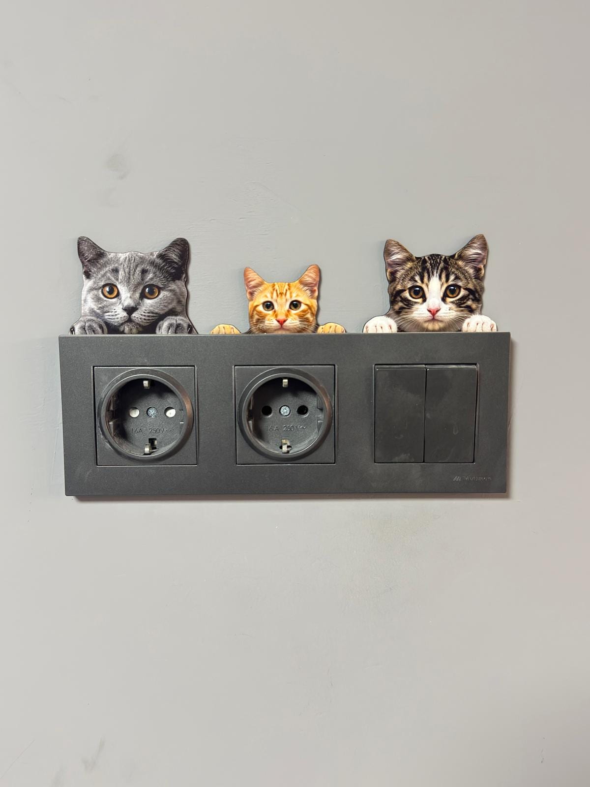 🎨 Design: Set includes 3 different cat faces 📐 Size: Fits standard EU sockets and switches 🪵 Material: Laser-cut, hand-painted wood 🧲 Mounting: Easy stick-on with double-sided tape 🎁 Perfect for: Kids’ rooms, hallways, entryways, cat lovers, or fun gift ideas