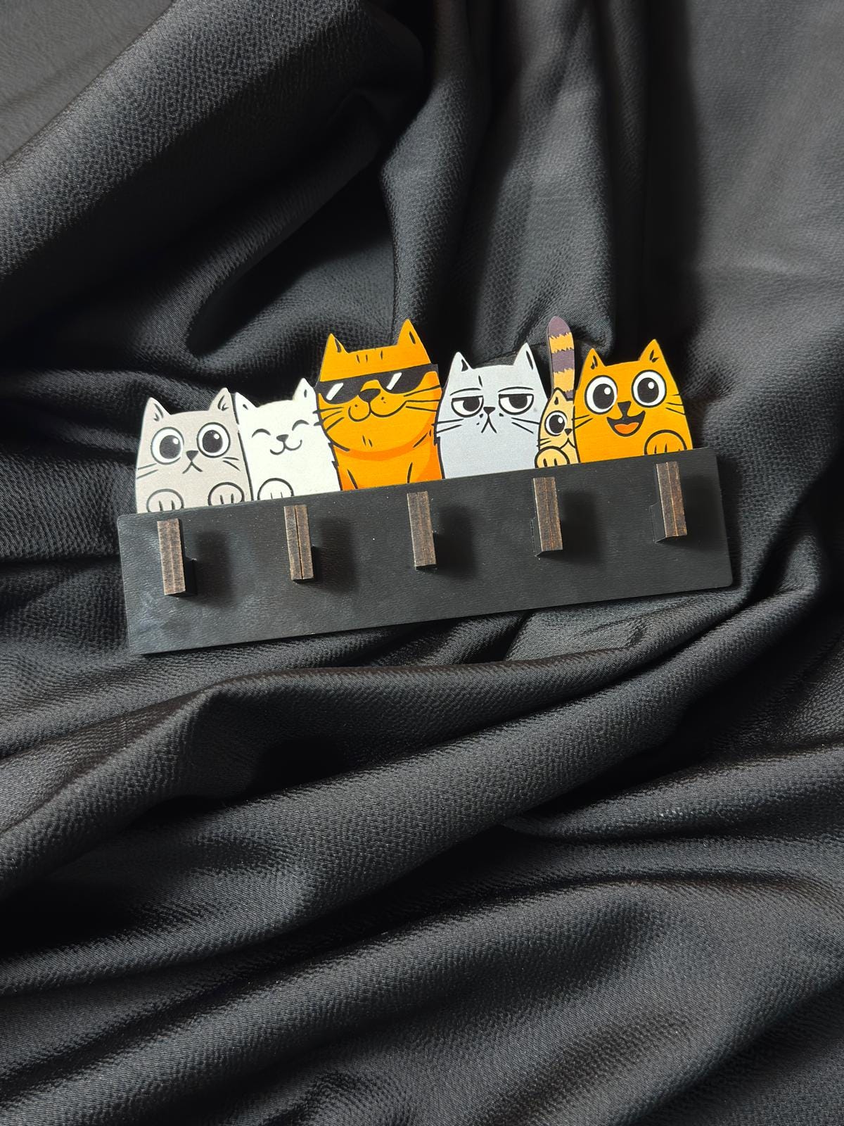 A fun and functional way to organize your keys! This cute cat-themed key holder is made from wood and features 5 durable hooks, perfect for hanging your keys, lanyards, or small accessories. With its charming and colorful cartoon cat designs, it adds a playful touch to any room. It comes with strong double-sided adhesive tape, so you can mount it without tools, nails, or drilling—no damage to your walls!